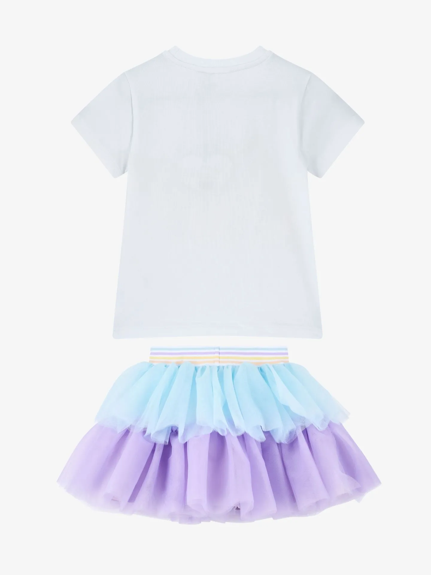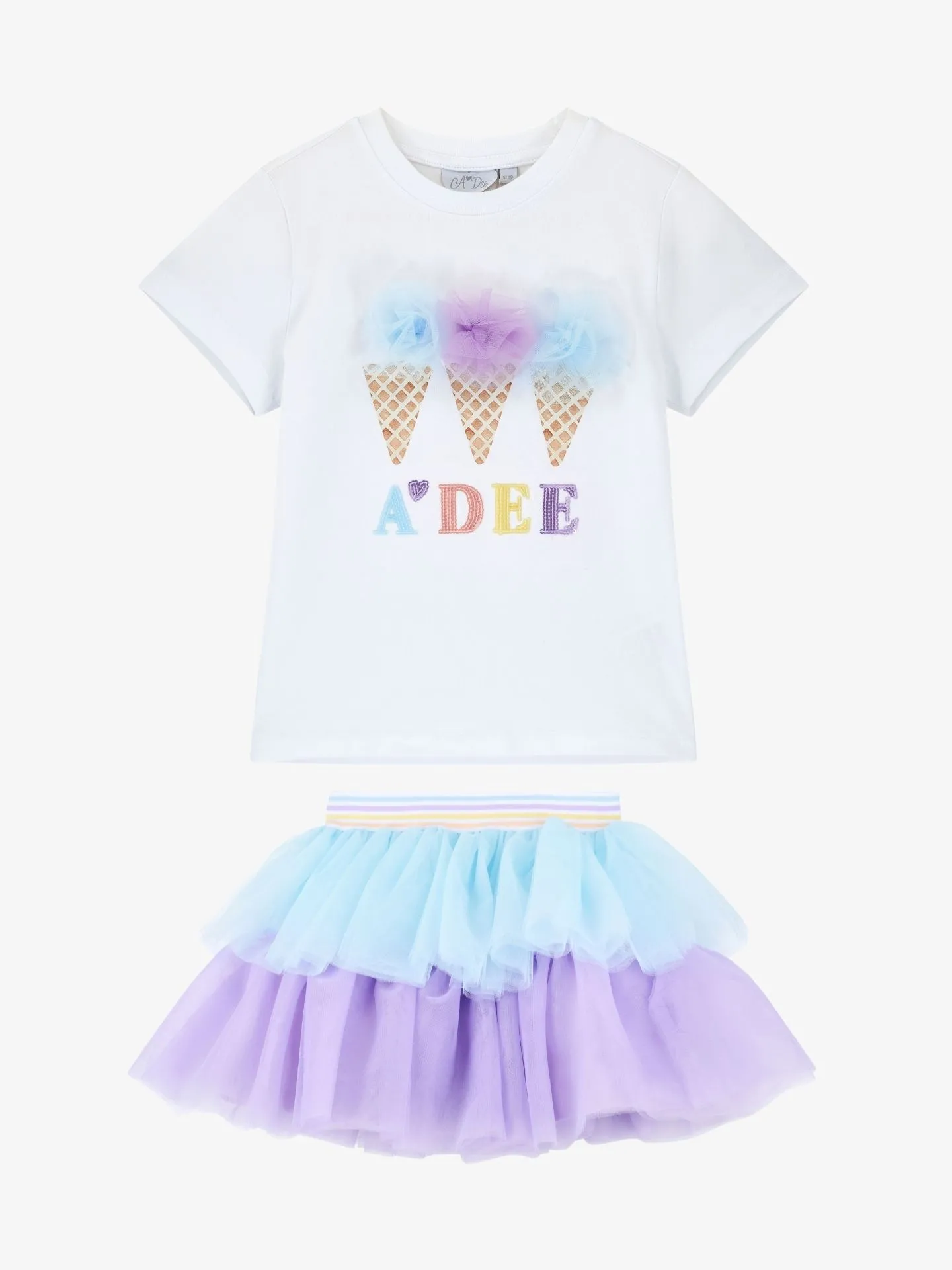 De Suzi rokset bestaat uit een witte jersey top met een ijsjesprint op de voorkant. De gelaagde rok is gemaakt van tule en heeft een gestreepte elastische tailleband voor een comfortabele pasvorm.