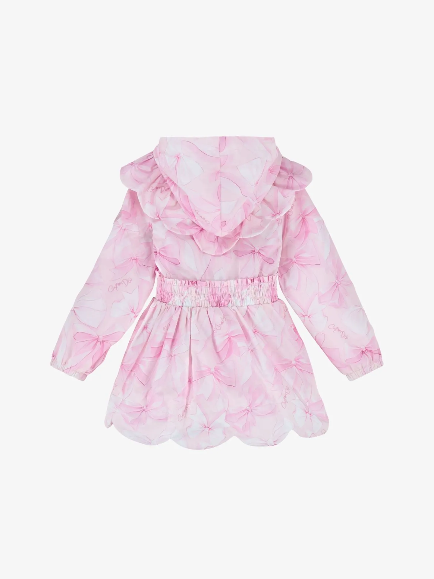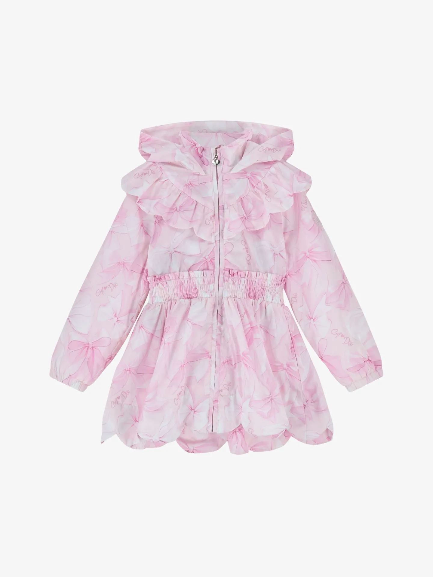 Maak kennis met de River-jas. Gemaakt van zijdezacht polyester, met een all-over strikkenprint, een gegolfde zoom met ruches, een kraag met ruches en een oversized capuchon. Afgewerkt met een rits met strasssteentjes, een merktrekker en een logobadge op een mouw.