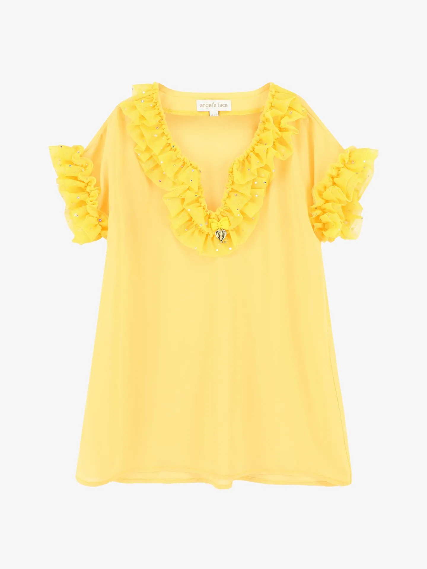 De Angels Face Irena Kaftan in de kleur Sparkle Dandelion heeft tulle lagen met glitters. De kaftan kun je combineren met de bijpassende badpak of bikini.