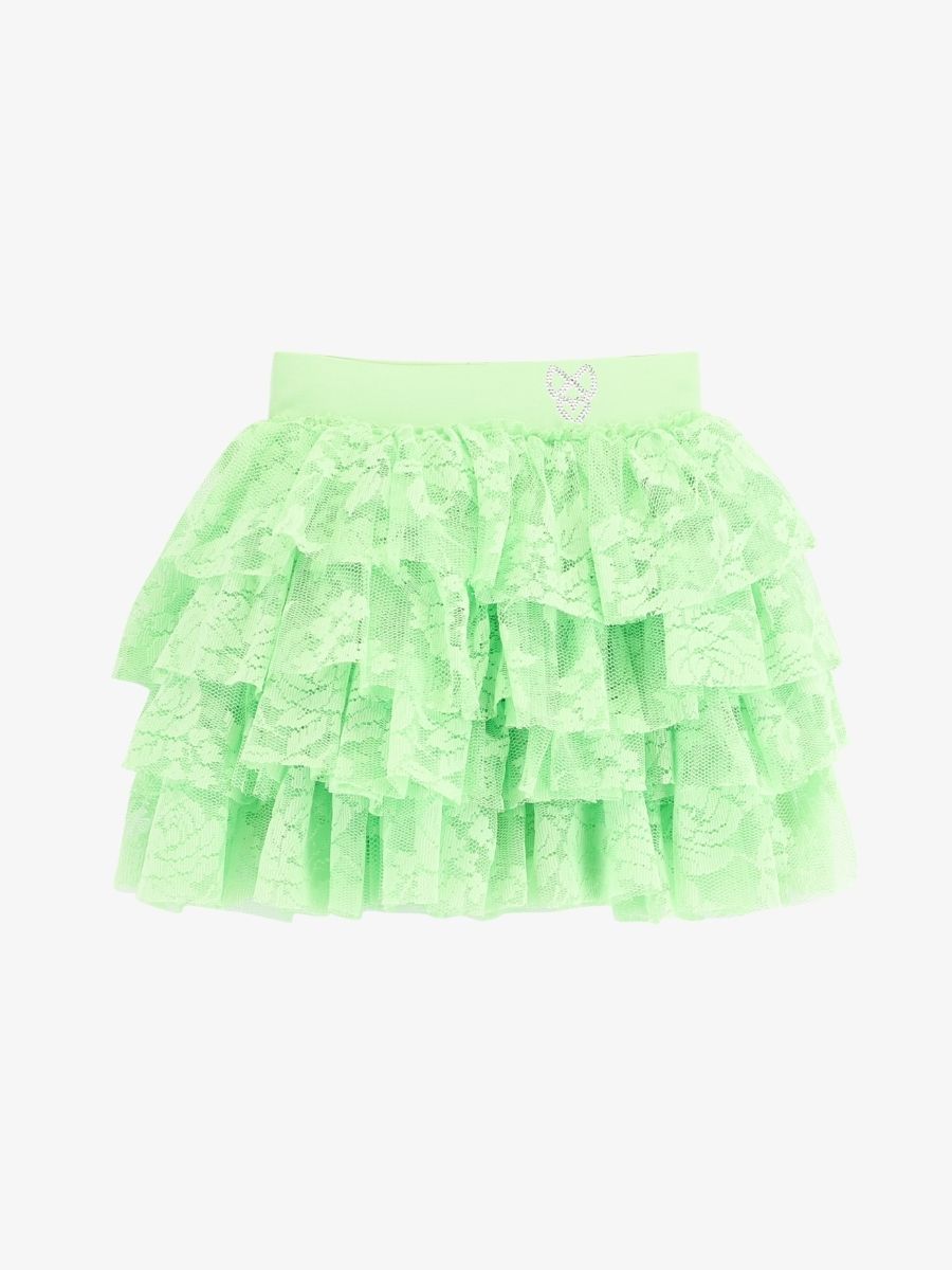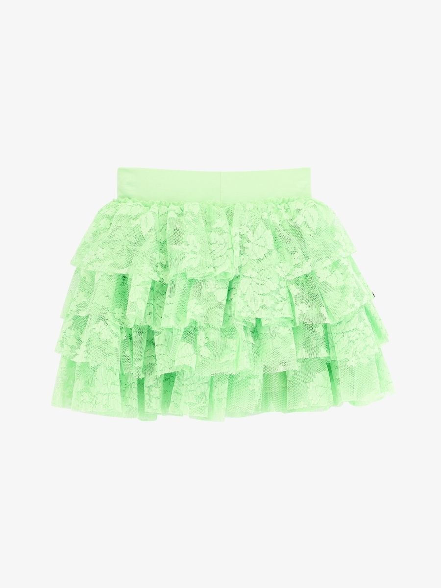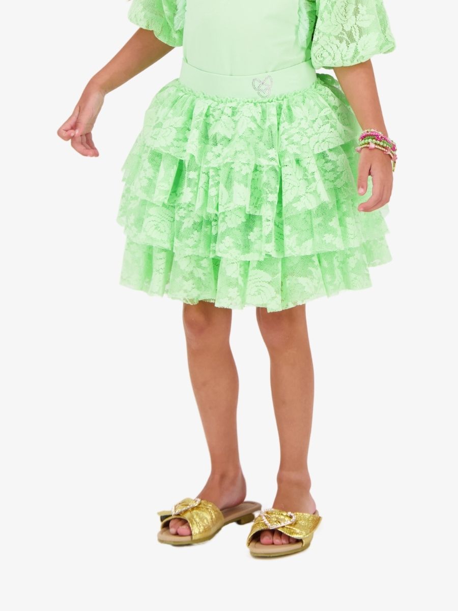 De Angels Face Abbie Rok in Groen heeft een elastische tailleband. De rok heeft vier lagen met kant. Combineer de rok met de bijpassende Angels Face top.