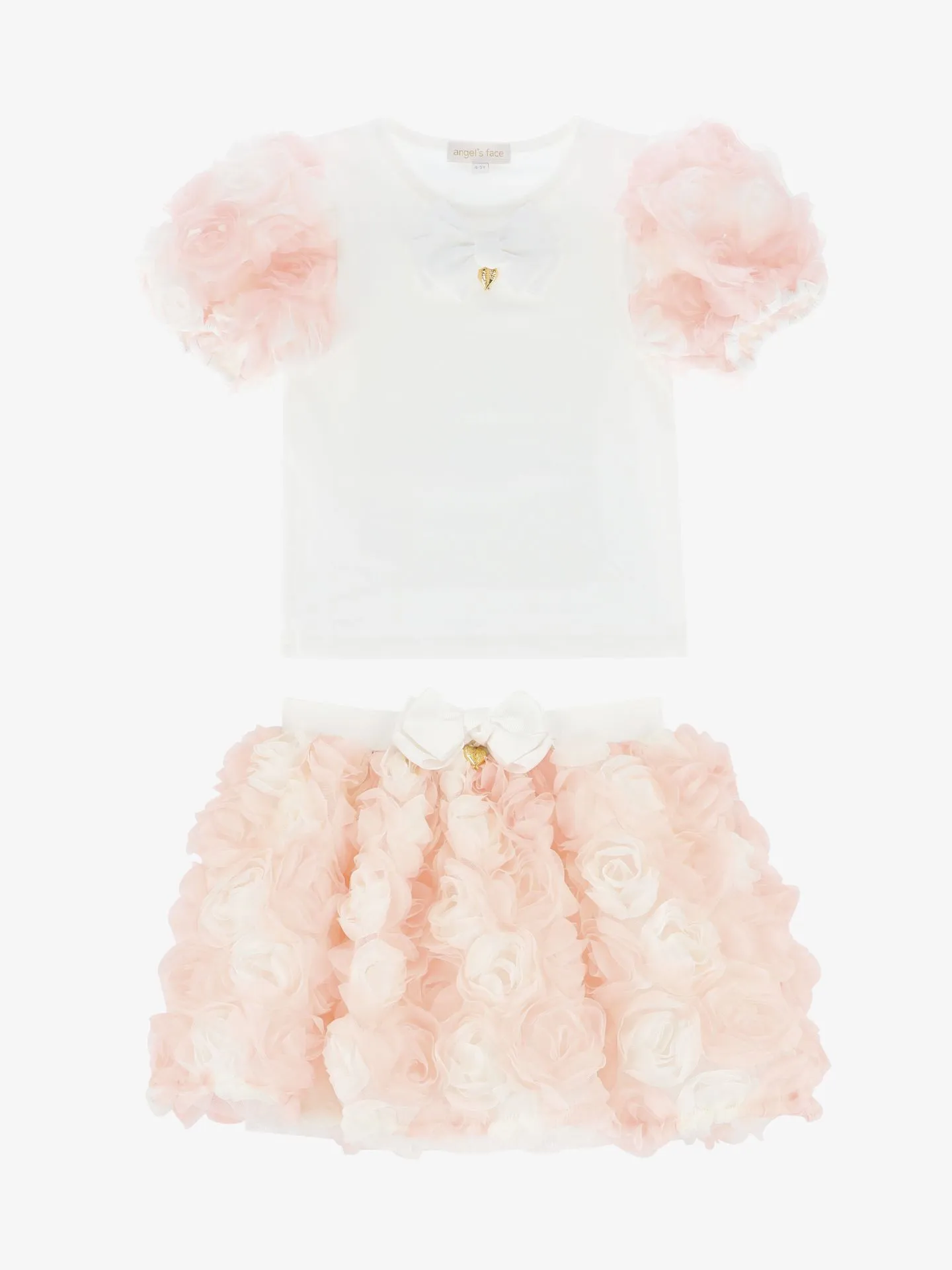 De Angels Face Roses Set in de kleur Snowdrop Pink bestaat uit een rok met elastieke tailleband, 3d bloemen en strik. De top heeft een strik en pofmouwen met 3d rozen.