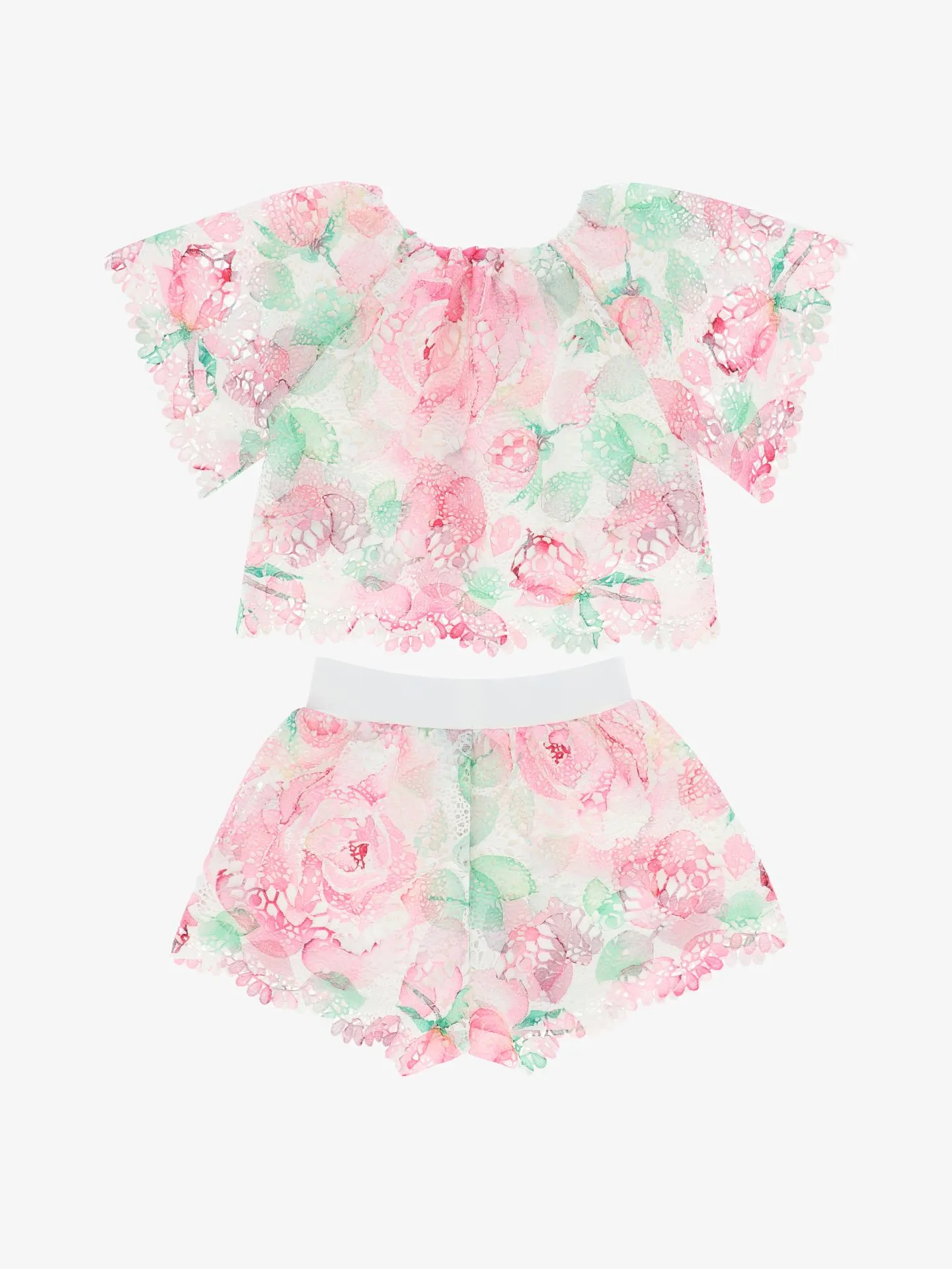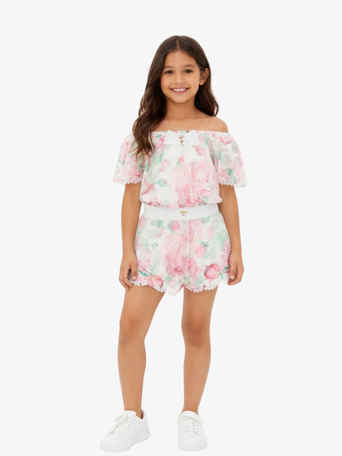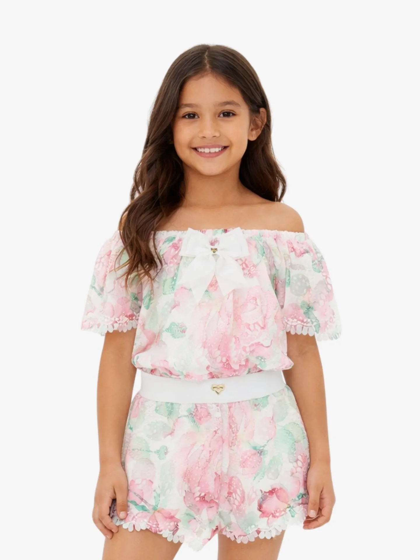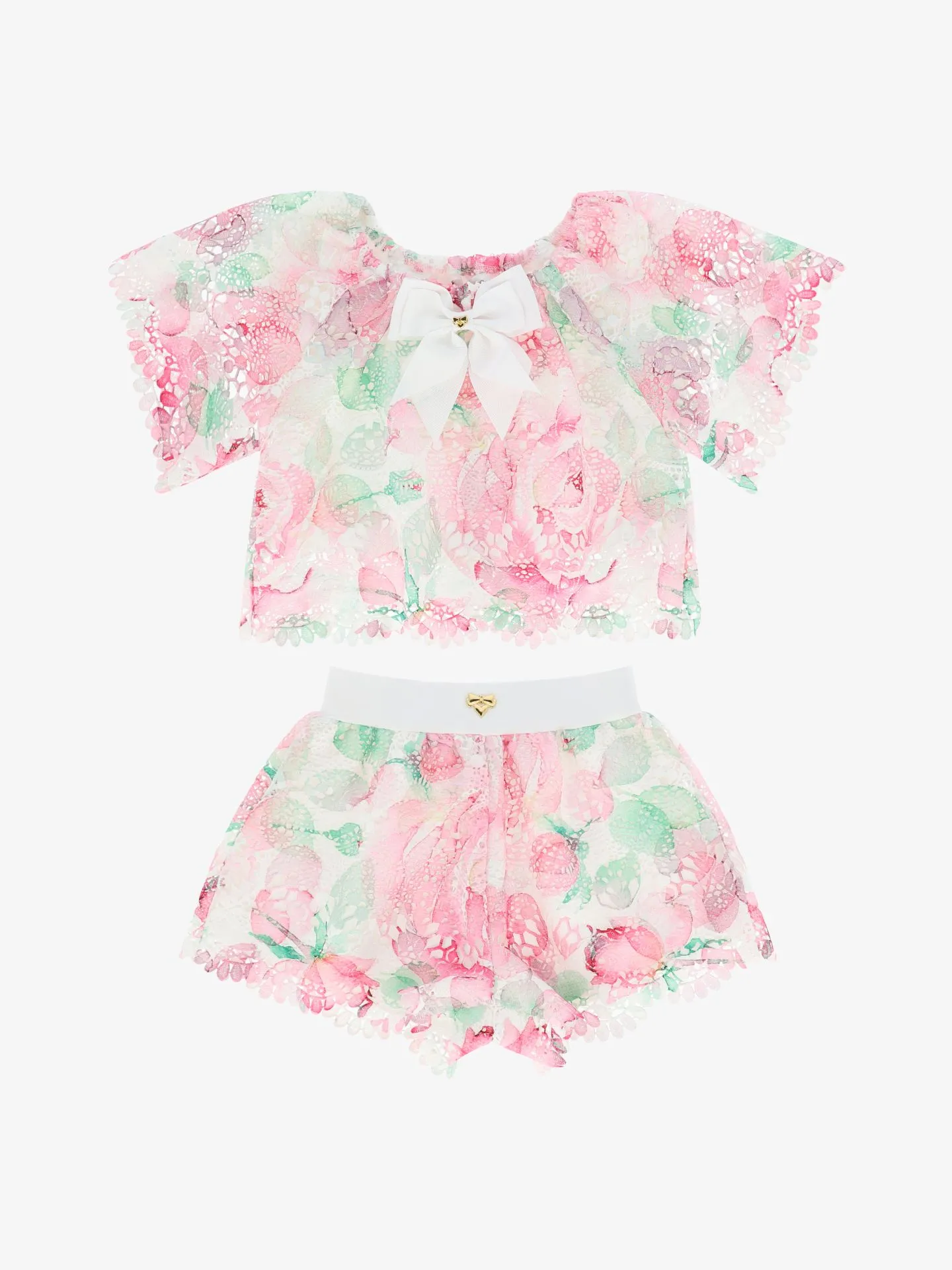 Tweedelige kanten set met bloemenprint, bestaande uit een off-shoulder top en een bijpassende short. Ontworpen met een verfijnde roze rozenprint en gedetailleerde kanten afwerkingen. Voorzien van een grote kenmerkende strik met onze iconische gouden hart-bedel aan de voorzijde.