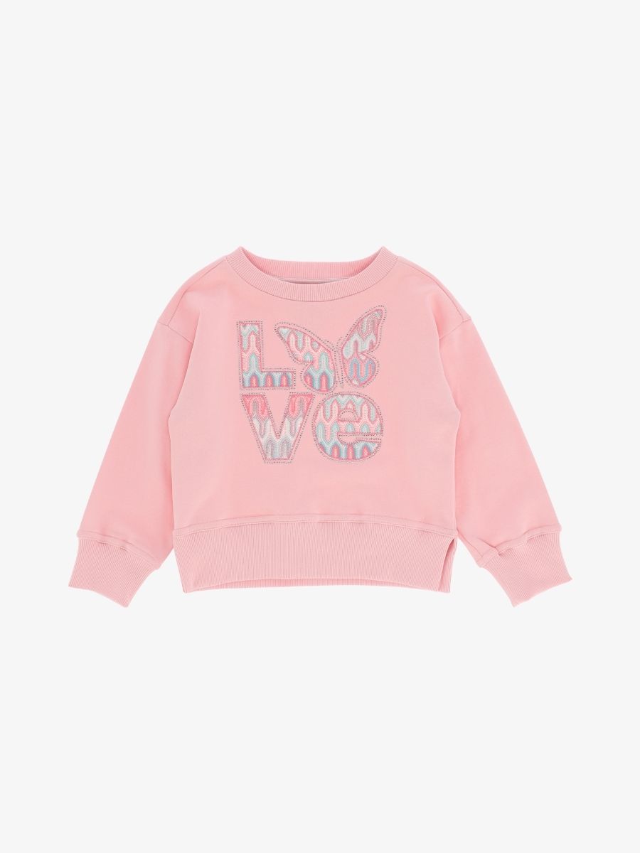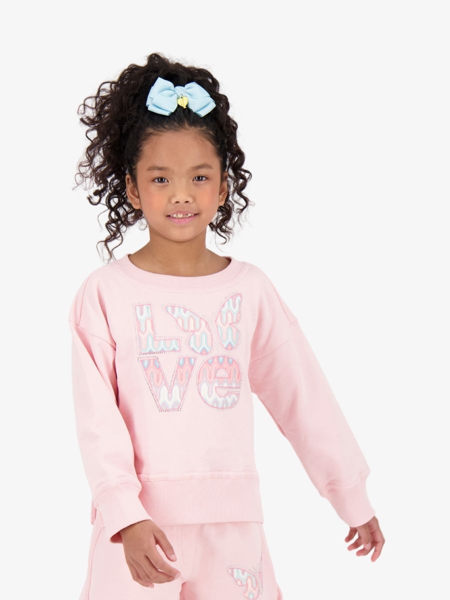 Love Logo Roze trui van het merk Angels Face. De trui heeft de kleur roze. Op de trui staat Love ingeweven. Het truitje is te combineren met het Shortje Adriana Butterfly Pale Pink van Angels Face.