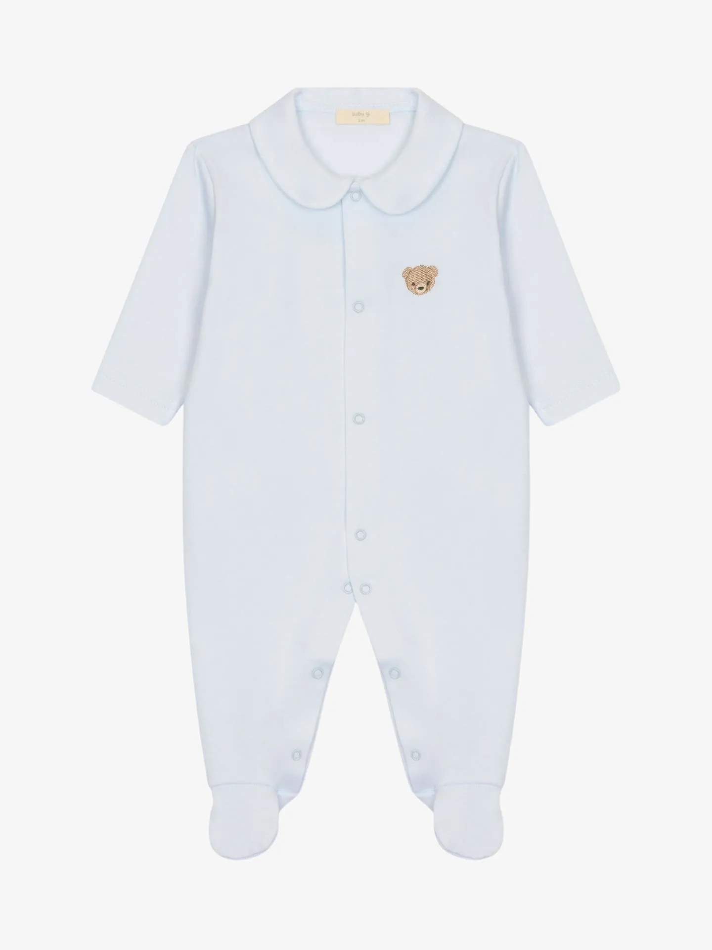 Boxpakje van het merk Baby Gi. Het katoenen boxpakje met voetjes heeft een platte Peter Pan kraag, geborduurd beertje aan de linkervoorzijde en een drukknoopsluiting aan de voorzijde.