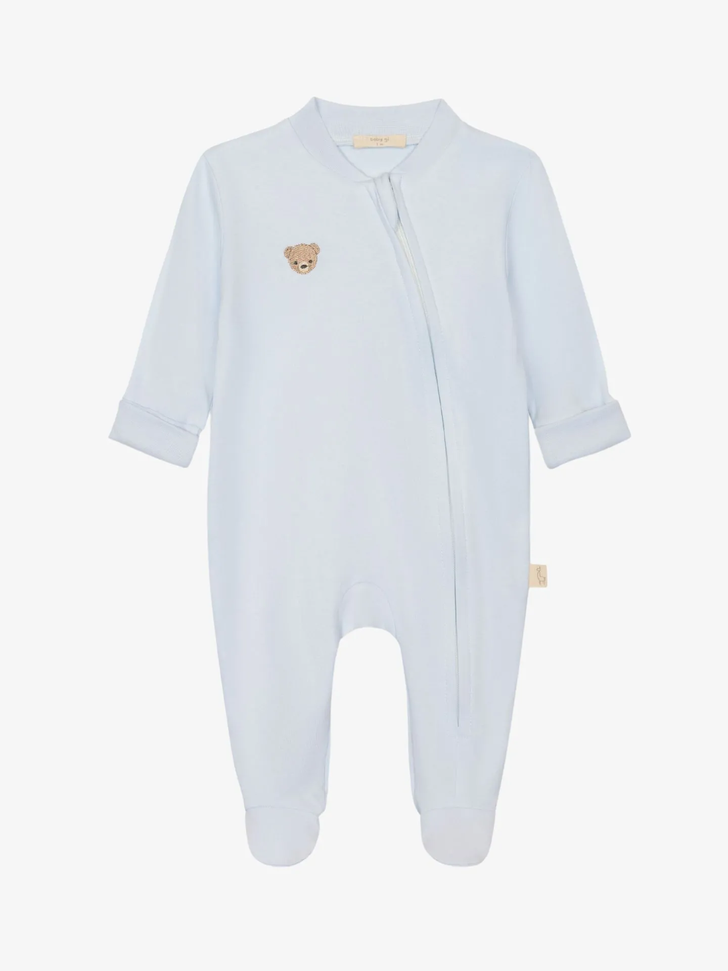Boxpakje van het merk Baby Gi. Het katoenen boxpakje met voetjes heeft een platte Peter Pan kraag, geborduurd beertje op het borstzakje en een drukknoopsluiting aan de voorzijde.