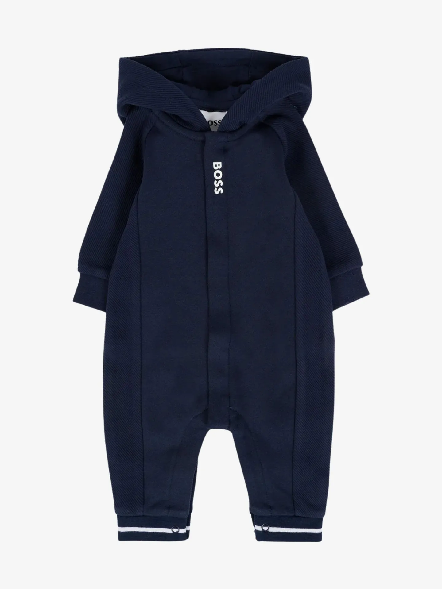 Blauw boxpakje met lange mouwen, capuchon, drukknoopsluiting aan de voorkant en in het kruis, en geribbelde manchetten en enkels. Versierd met een wit logo op de voorkant.