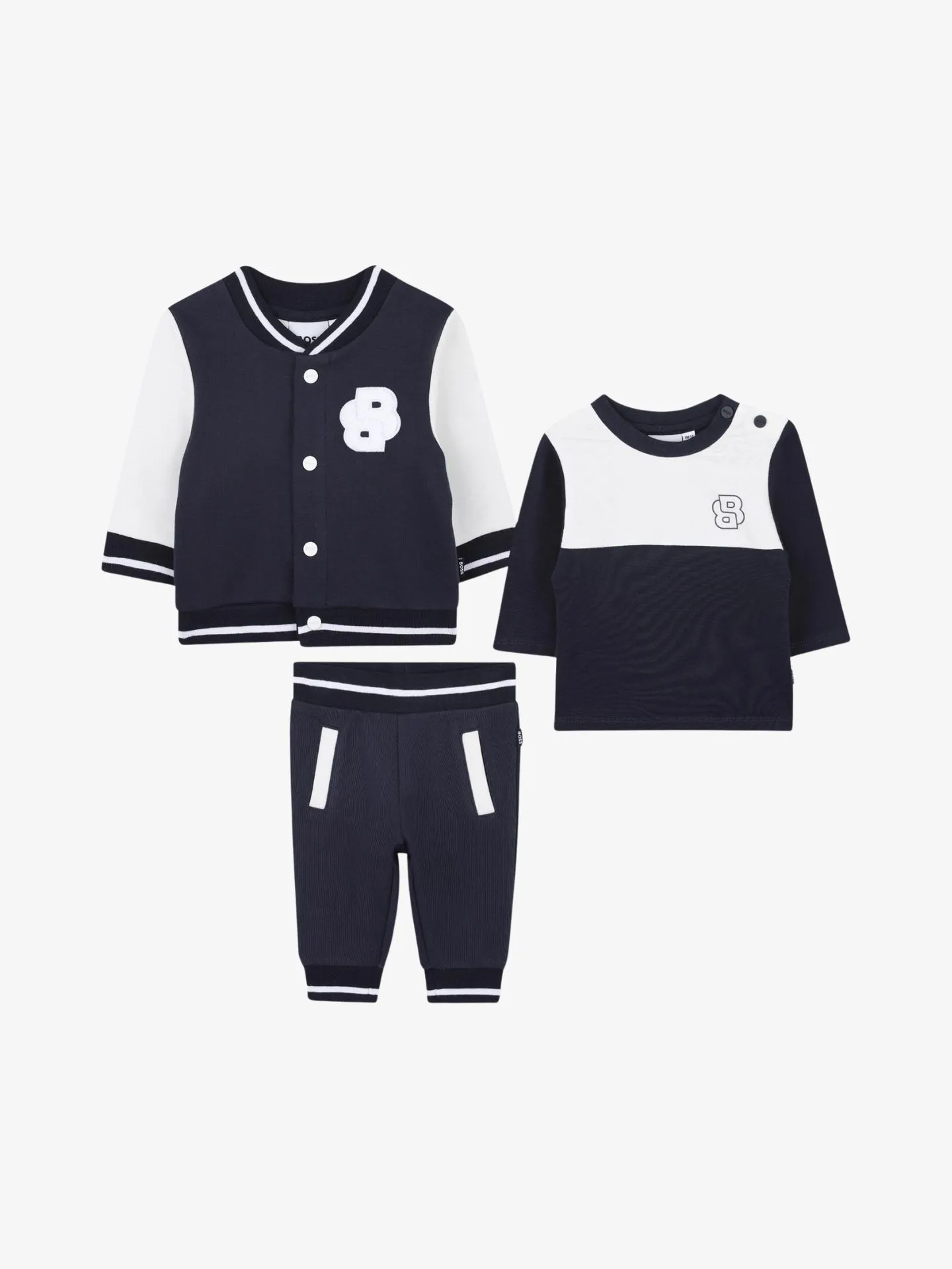 Een comfortabele en stijlvolle look voor de baby met dit BOSS-trio met contrasterende afwerkingen. Het jersey vest sluit met drukknopen en valt op door een geborduurde badstof patch op de borst en tweekleurige mouwen. De bijpassende broek heeft een gestreepte taille en enkels, contrasterende zakken en een logolabel. Het T-shirt met lange mouwen en dubbele B-print maakt de look af met zachtheid.