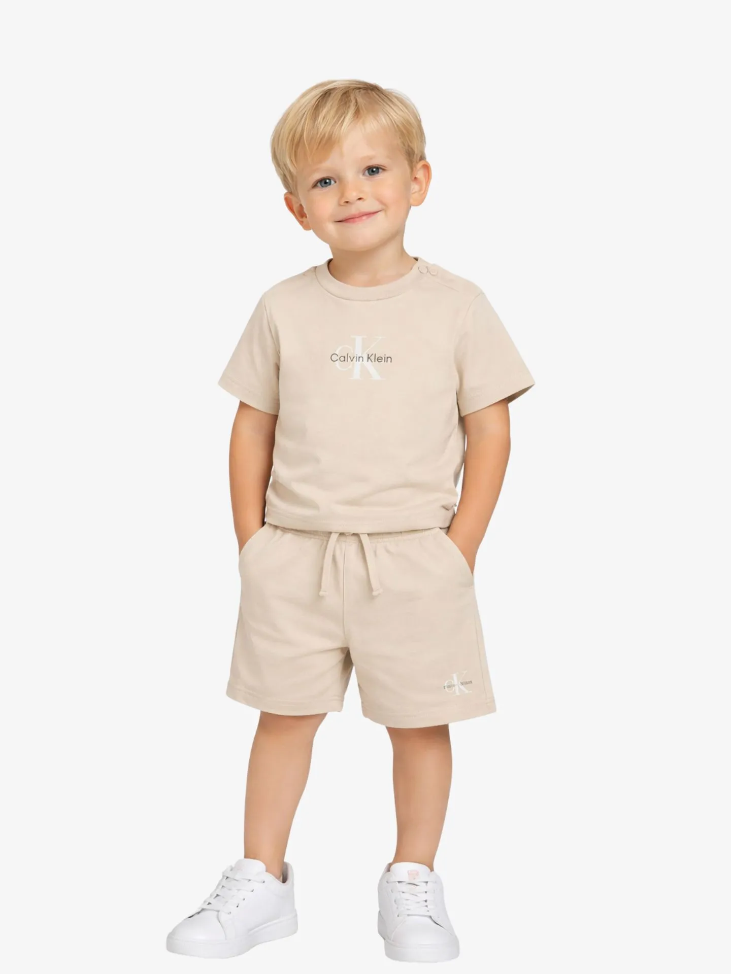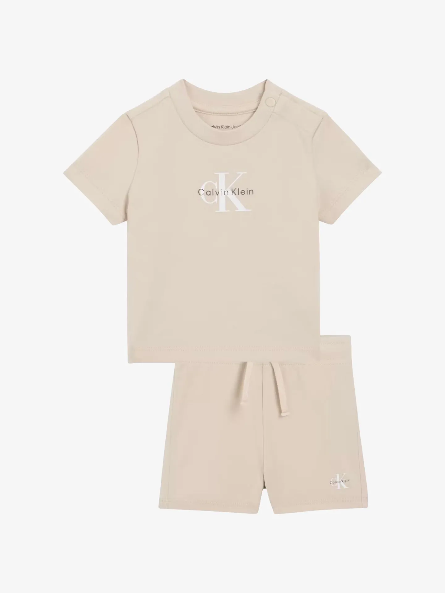 De Calvin Klein Set in de kleur Oatmeal heeft het logo geprint. Het broekje is aante snoeren in de taille en het shirt heeft in de kleine maatjes een drukknoopsluiting op de schouder.