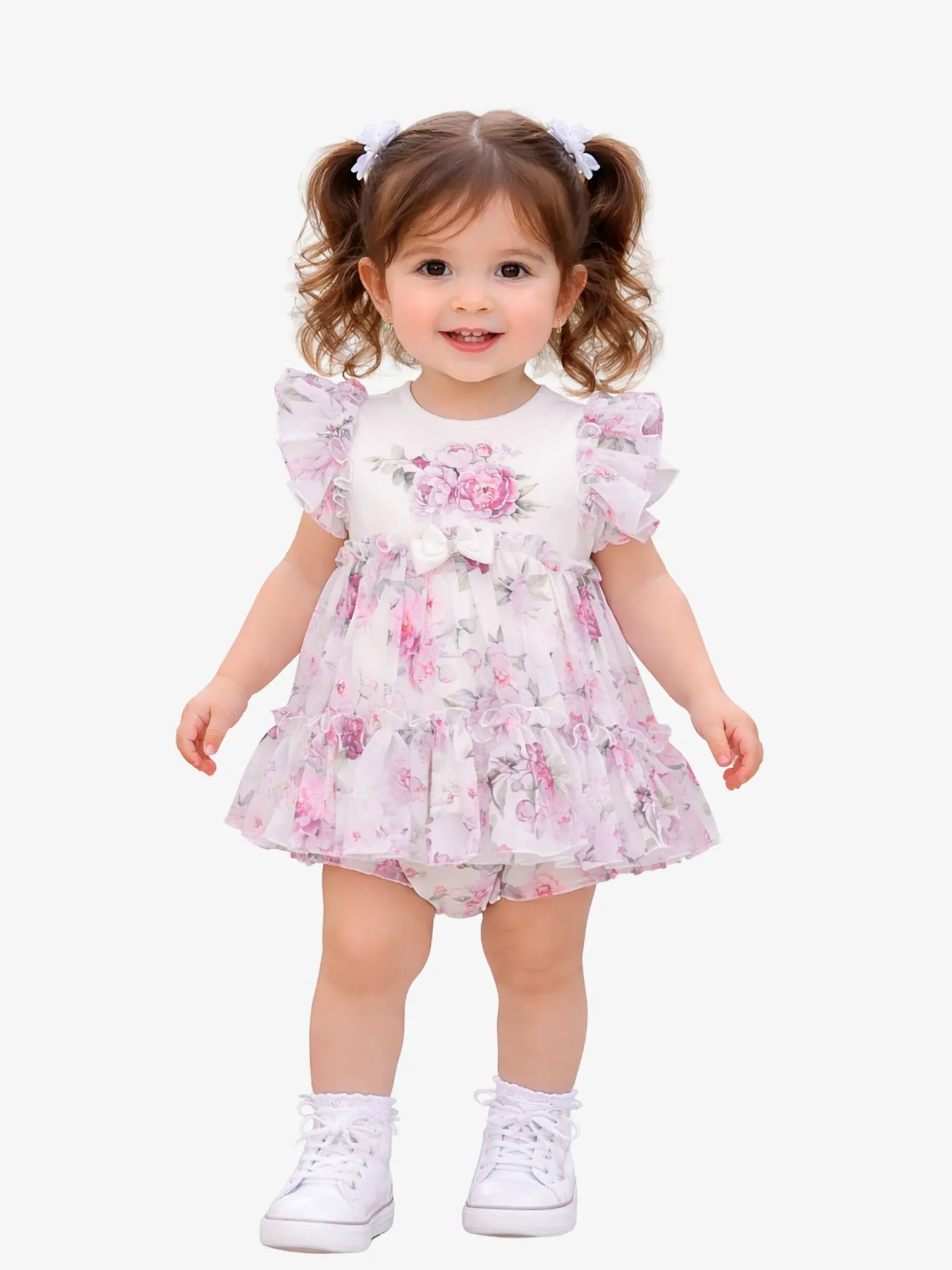 2-delige set van het Poolse merk Daga. De set bestaat uit een jurkje en bloomer. Het a-lijn jurkje heeft een ronde hals, ruches langs de armopeningen een strik in de taille bewerkt met steentjes en een bloemenprint aan de bovenzijde. De bloomer heeft een elastische tailleband en tule laagjes met bloemenopdruk.