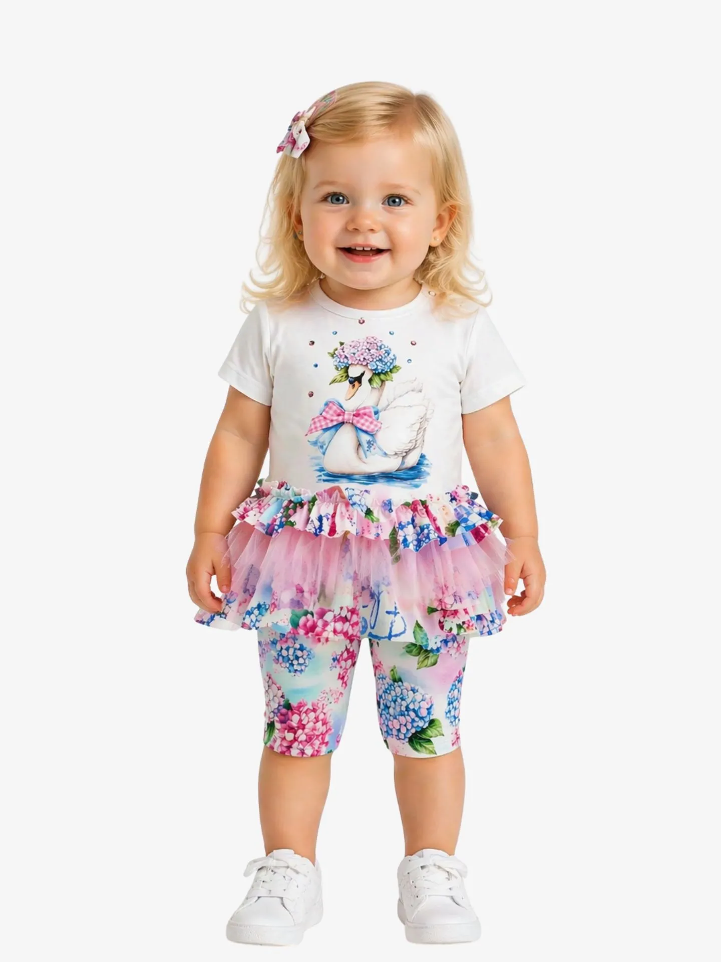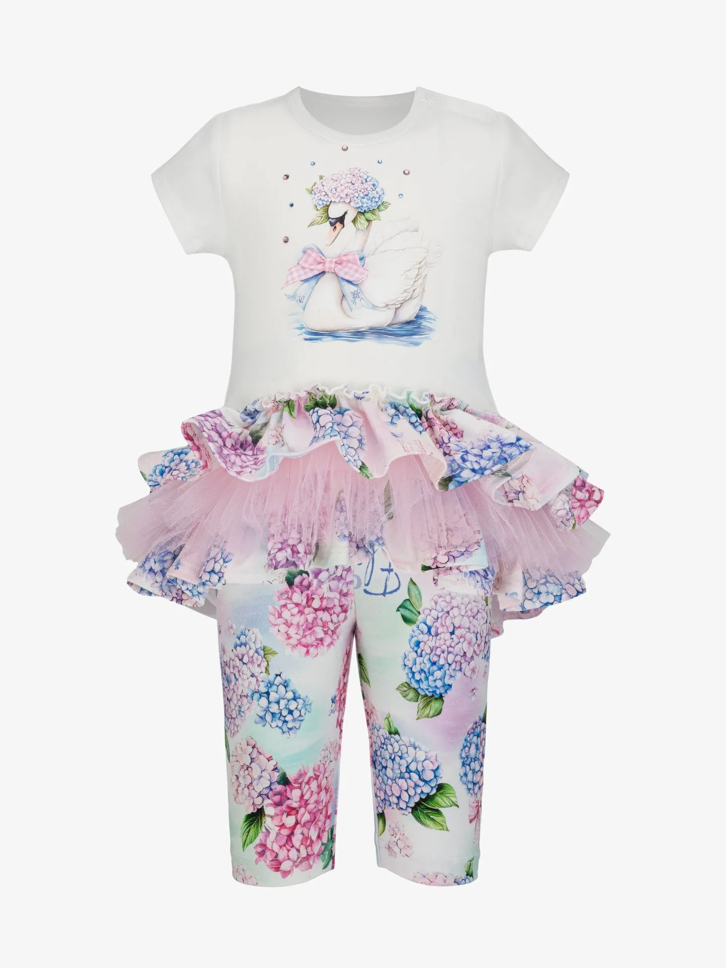 2-delige set van het Poolse merk Daga. De set bestaat uit een tuniek en legging. De tuniek heeft een ronde hals, korte mouwen, opdruk aan de voorzijde en ruches aan de onderzijde. De legging heeft een all-over print en een elastische tailleband.