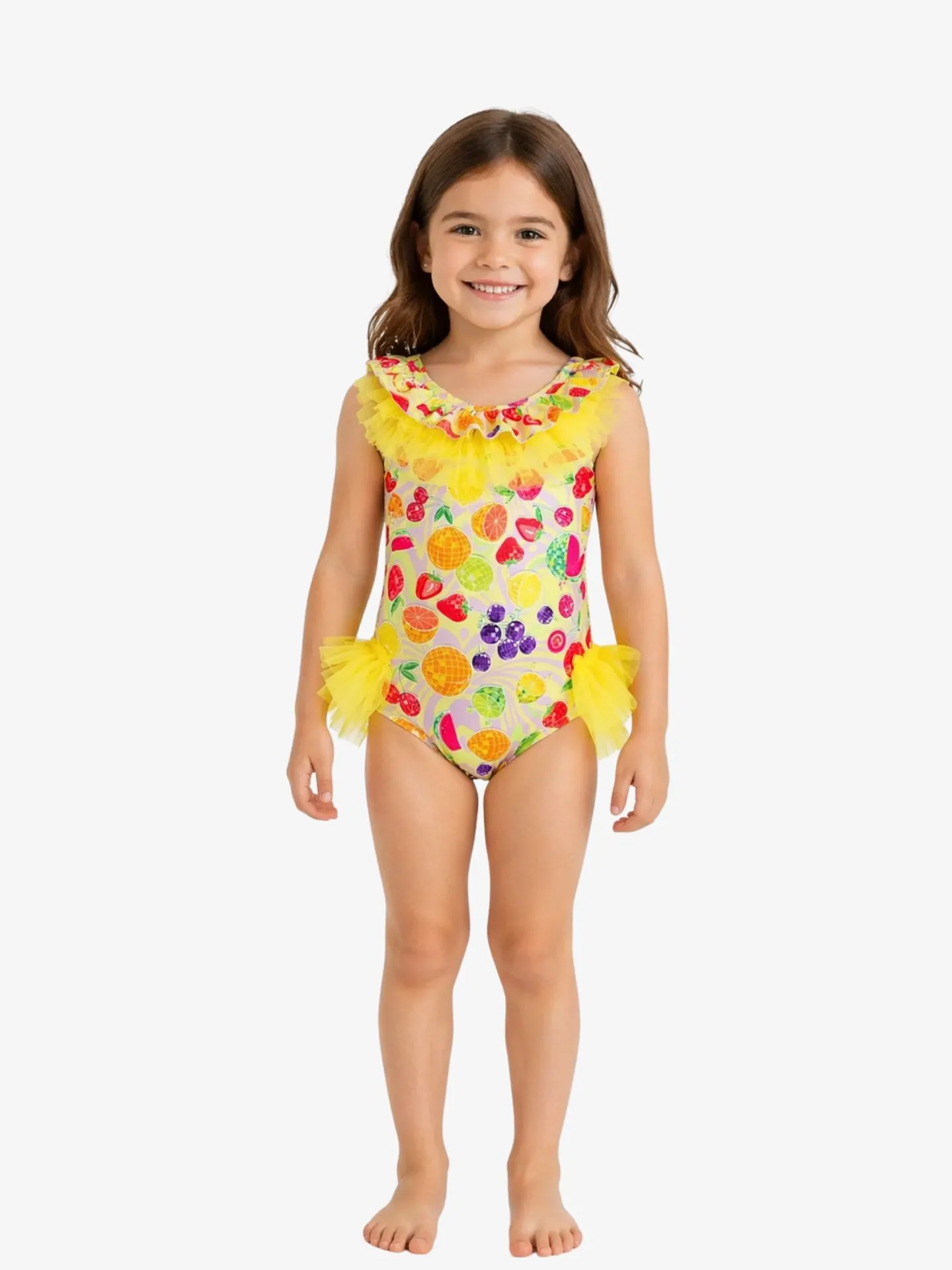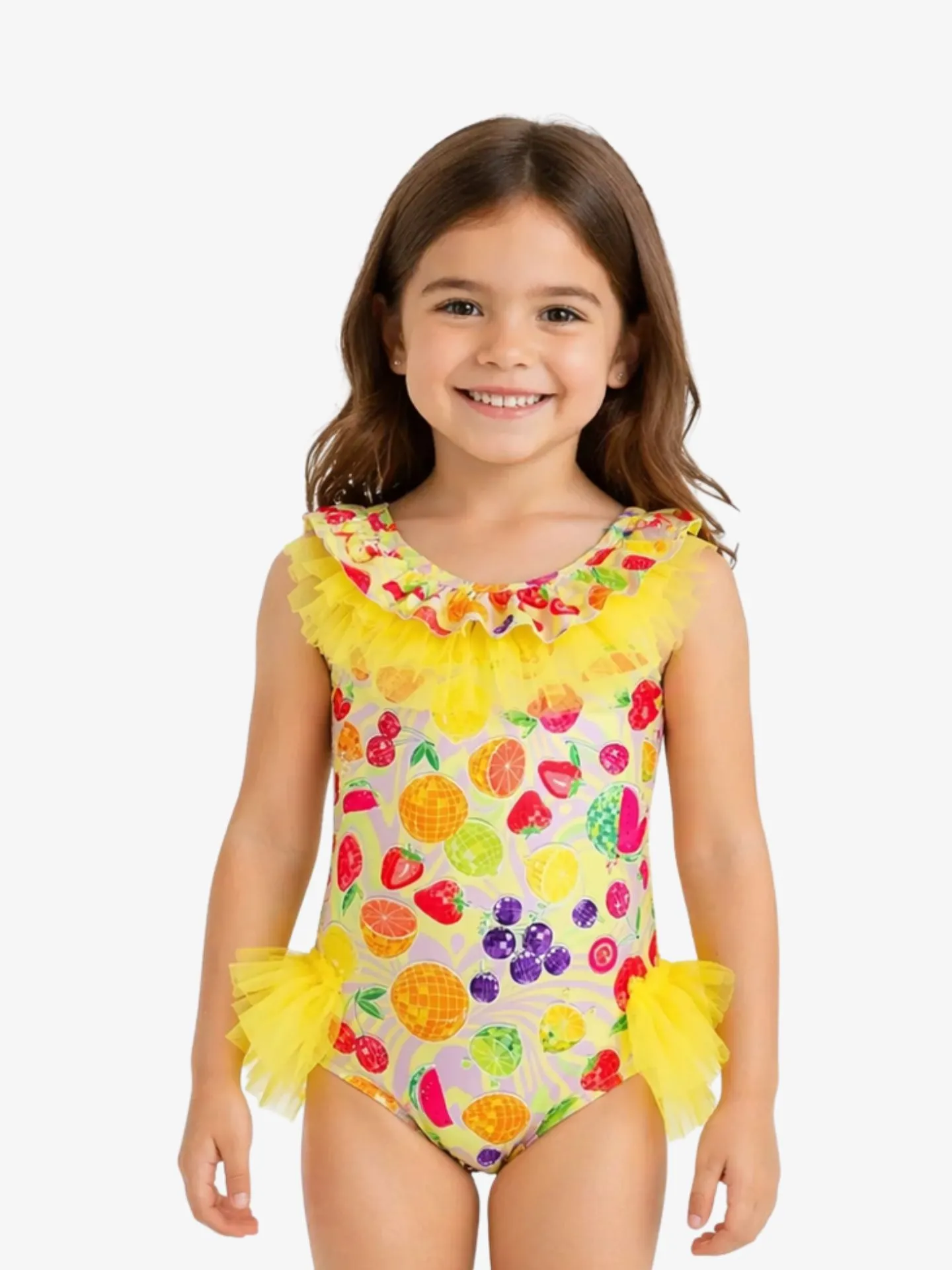 Kleurrijk badpak van het Poolse merk Daga. Het badpak met tule details en een opdruk met diverse soorten fruit. Combineer het badpak met de bijpassende items van de Tutti Frutti collectie voor een complete look.