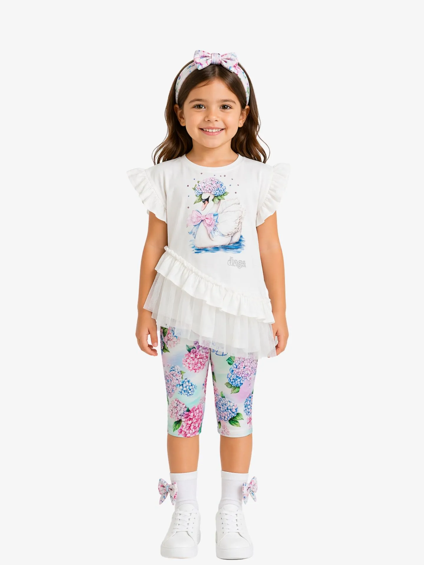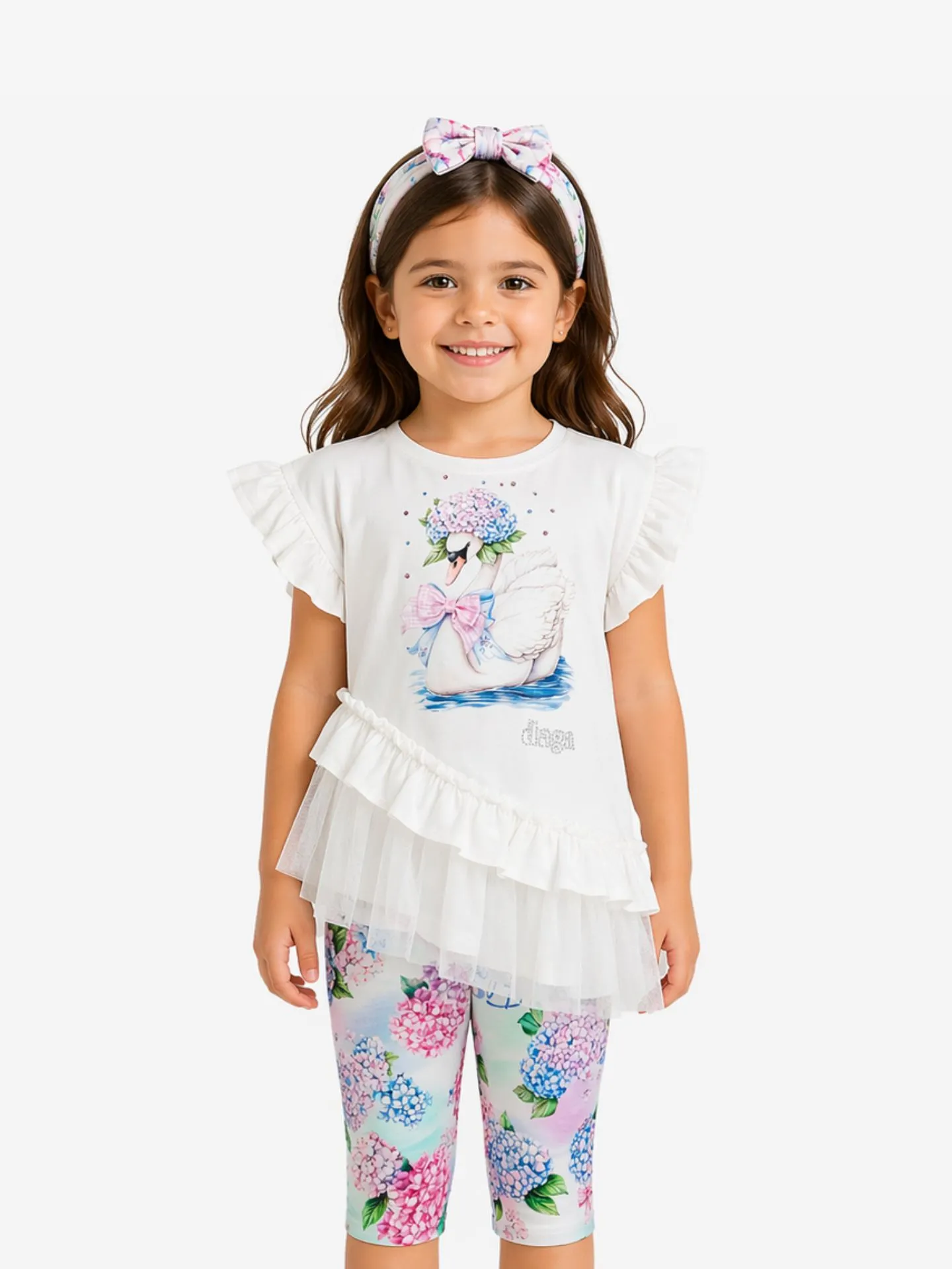 2-delige set van het Poolse merk Daga. De set bestaat uit een tuniek en legging. De tuniek heeft een ronde hals, korte mouwen, opdruk aan de voorzijde en schuine ruches aan de onderzijde. De legging heeft een all-over print en een elastische tailleband.