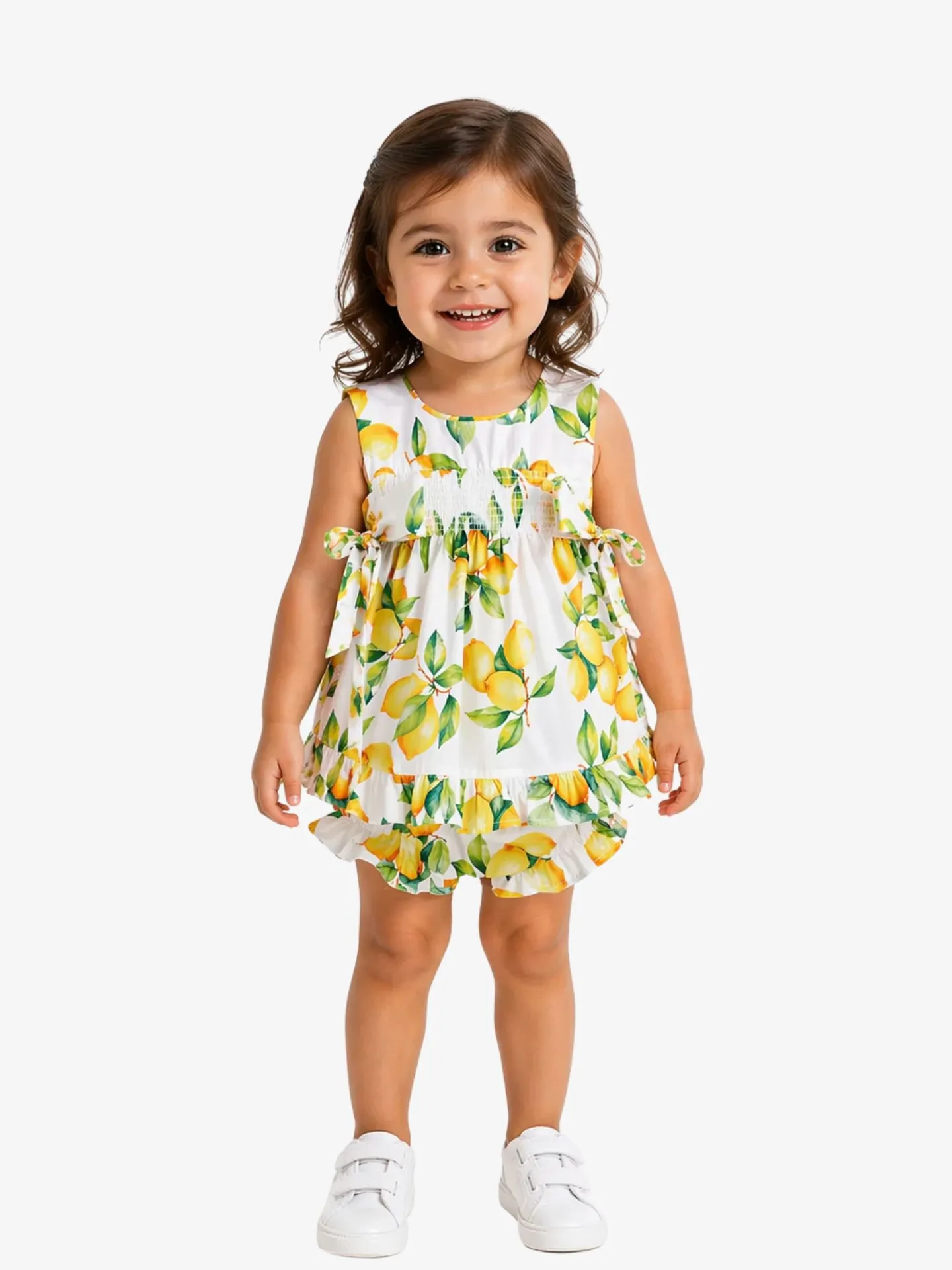 2-delige set van het Portugese merk Deolinda. De set bestaat uit een jurk en bloomer met all-over citroenen print. De jurk heeft open schouders met strikjes aan de mouwen, de bloomer heeft een elastische tailleband.