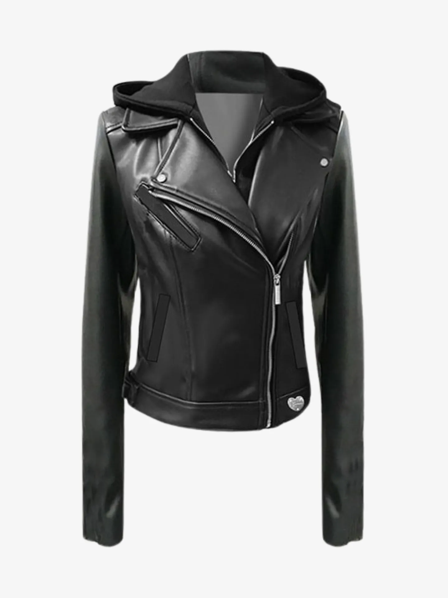 Fake leren jasje van het Amerikaanse merk Guess. Het zwarte jasje heeft een capuchon, lange mouwen, steekzakken en een klein metalen logo aan de linker onderzijde.