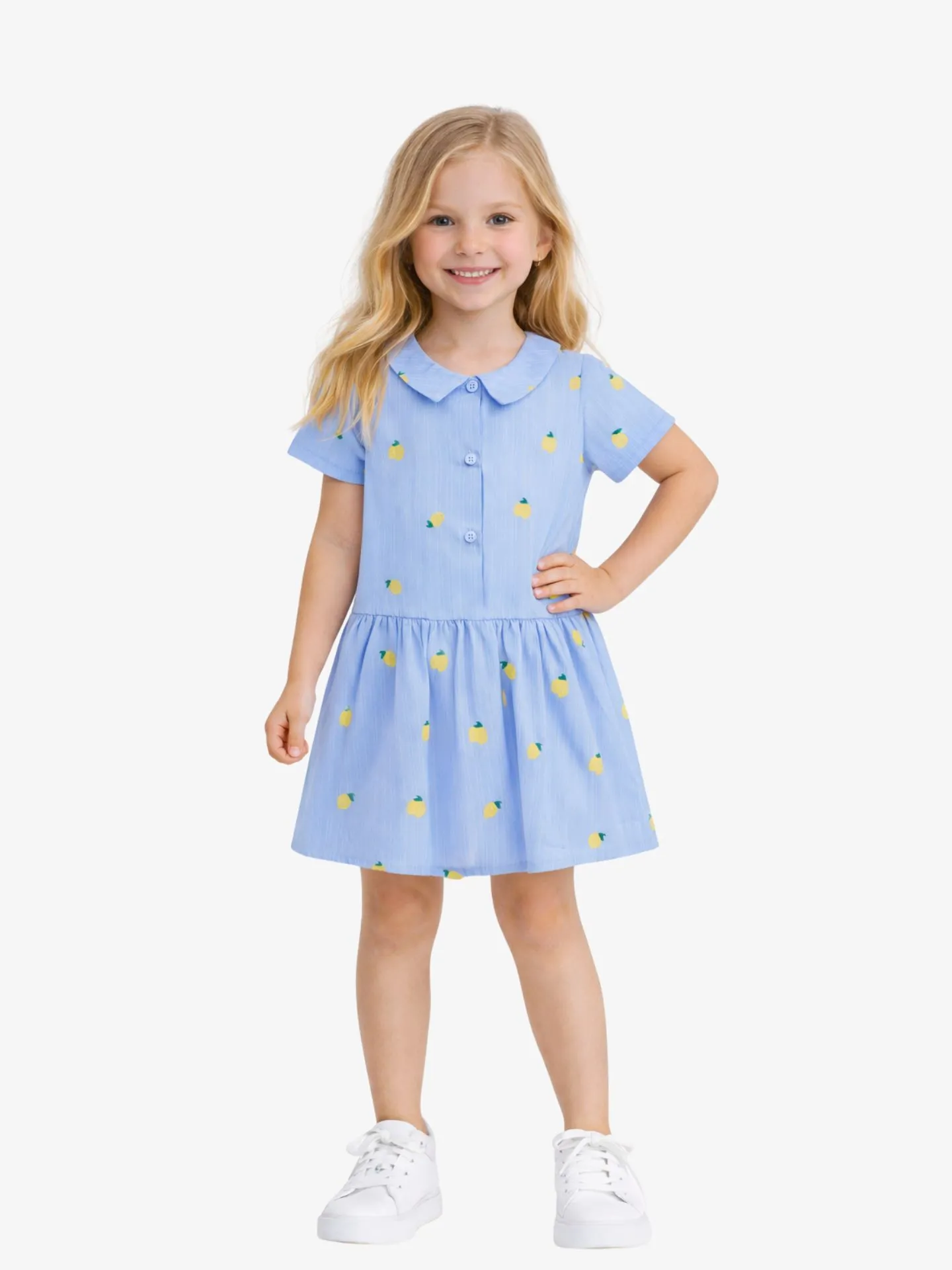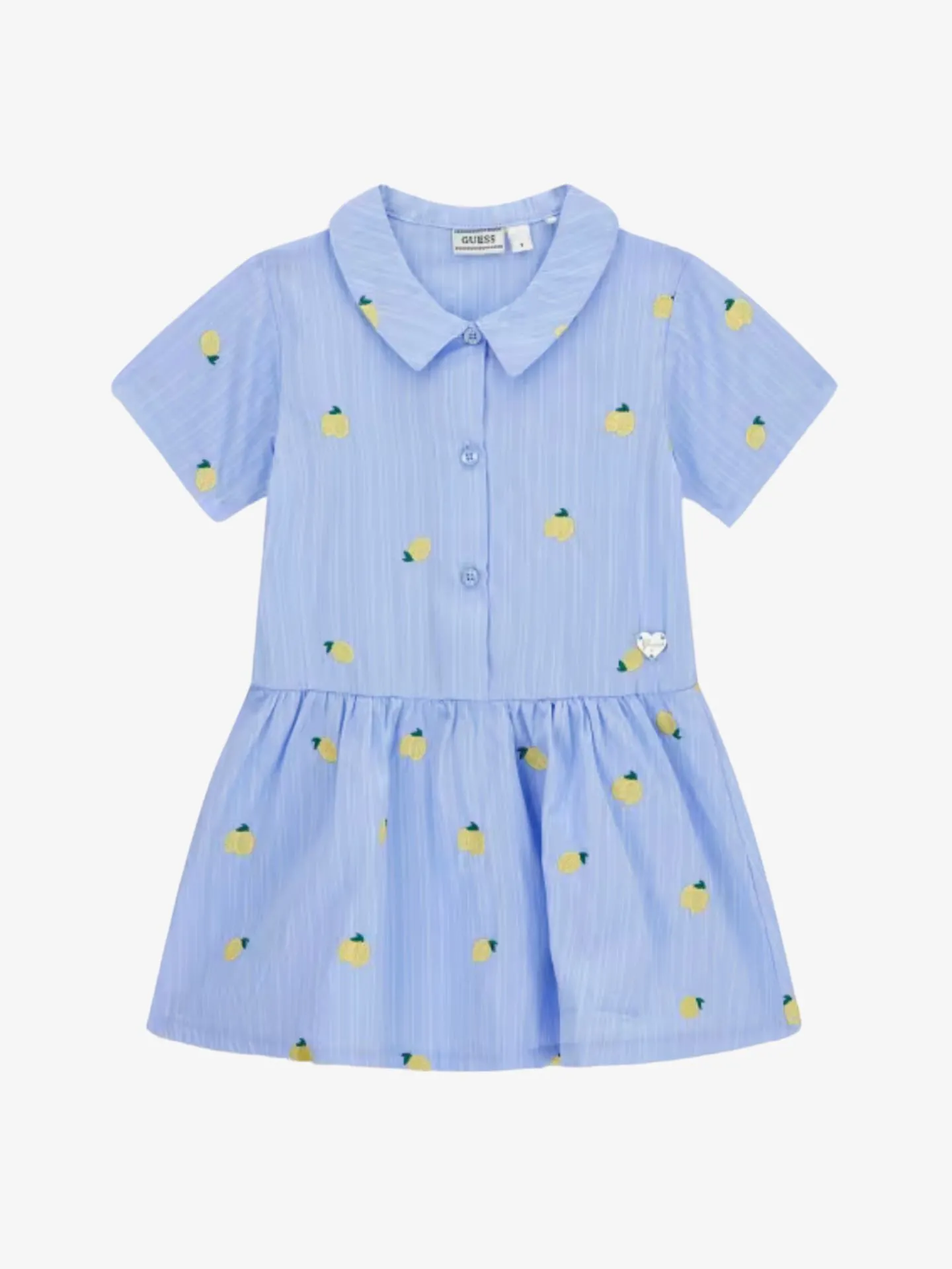 Breng de zomer in de garderobe van je kleine meid met deze charmante Poplin Lemon Dress van Guess Kids. Deze jurk is de perfecte combinatie van een klassieke stijl en een speelse uitstraling, uitgevoerd in een frisse lichtblauwe kleur met een vrolijke all-over print van gele citroenen. De jurk is vervaardigd uit hoogwaardig, luchtig katoen-poplin, wat zorgt voor een lichtgewicht en ademend gevoel, ideaal voor warme zonnige dagen. Het ontwerp van de jurk is zowel netjes als comfortabel, met een klassieke polokraag en een functionele knoopsluiting aan de voorzijde. De licht uitlopende rok met subtiele rimpelingen bij de taille geeft de jurk een zwierig effect, perfect voor elk zomerse avontuur of een feestelijke gelegenheid. Als herkenbaar detail is de jurk voorzien van een klein, zilverkleurig hartvormig Guess-logo bij de taille, wat zorgt voor een exclusieve finishing touch. Dankzij de korte mouwen en de duurzame kwaliteit van het katoen biedt deze jurk de hele dag door optimaal draaggemak en een modieuze look die seizoen na seizoen straalt.