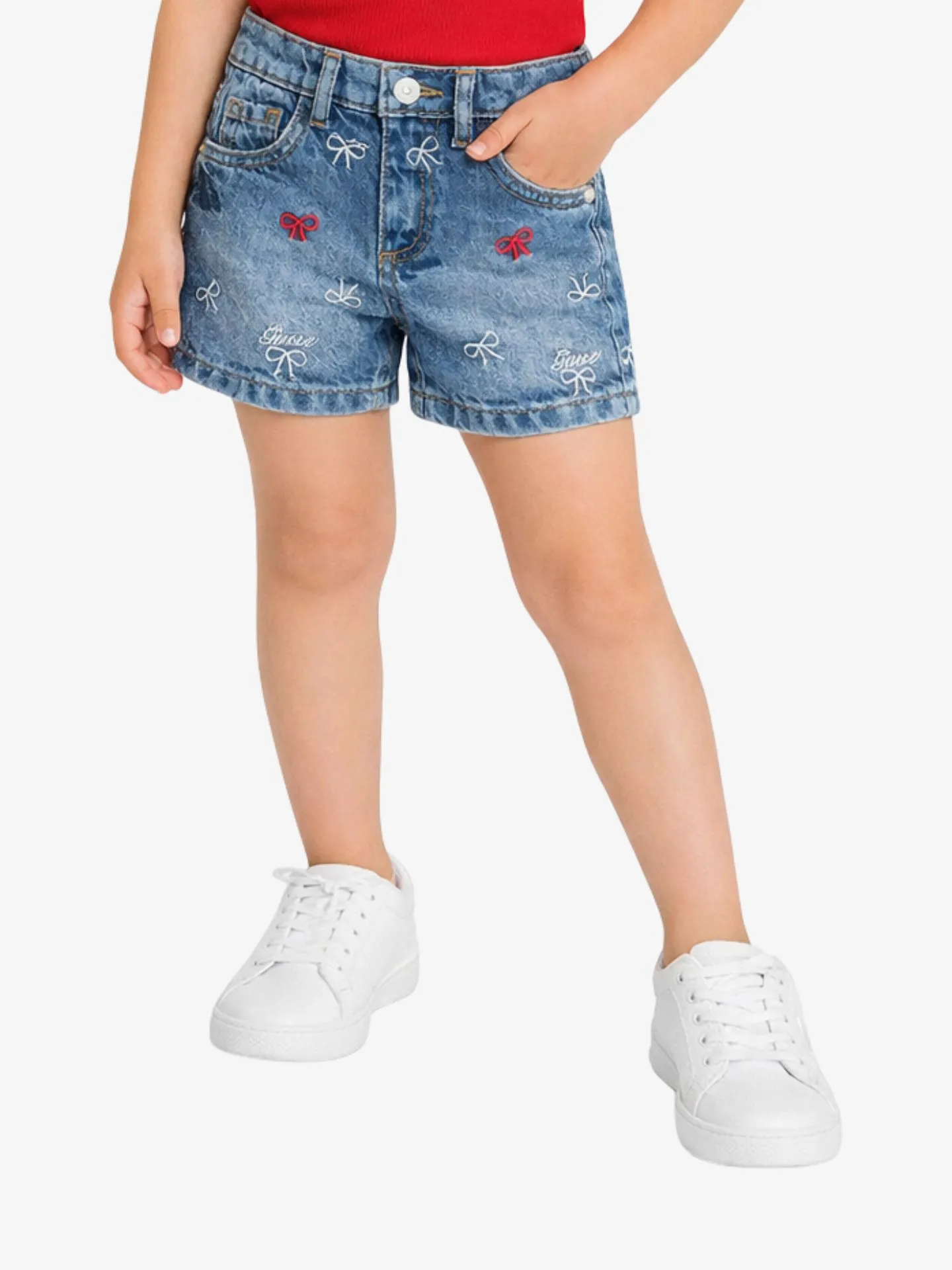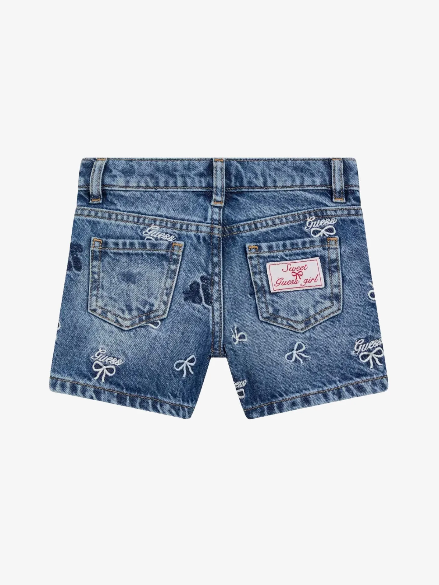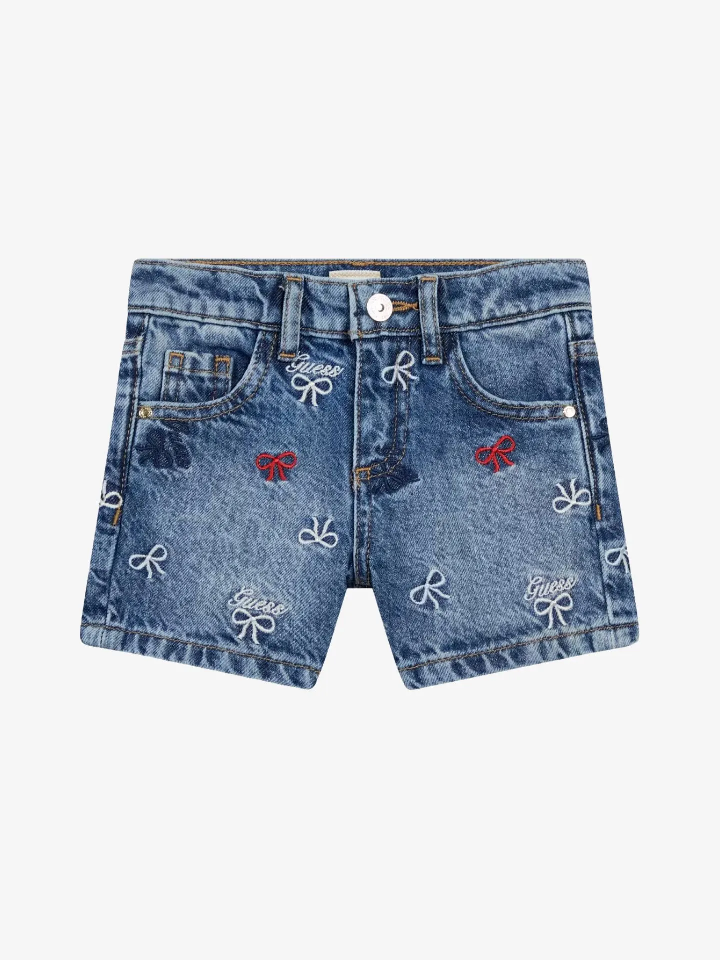Denim short van het Amerikaanse merk Guess. De spijkershort heeft een knoop- en ritssluiting, steekzakken aan de voorzijde en opgestikte zakken aan de achterkant en geborduurde strikken all-over.