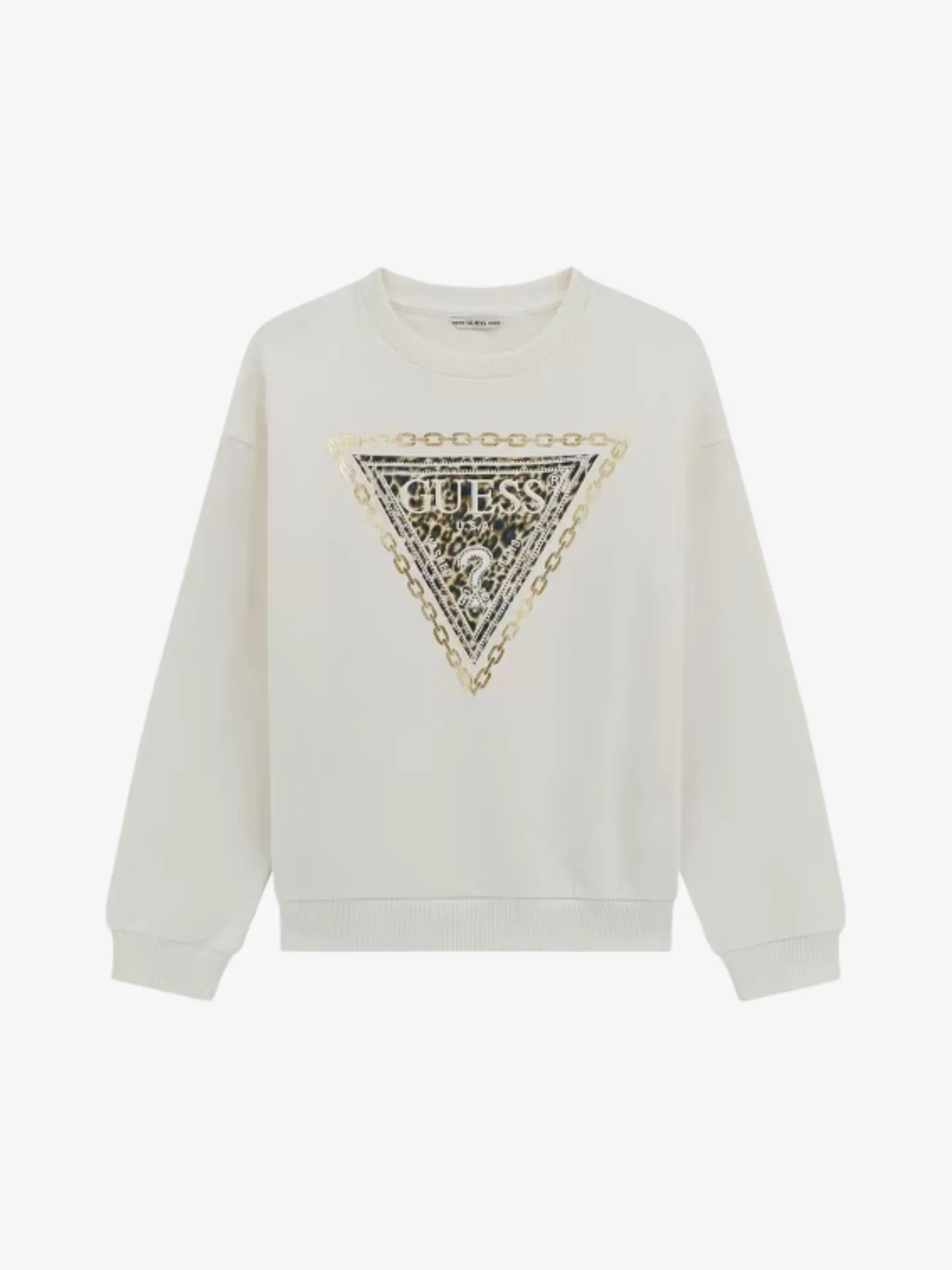 Creme kleurige sweater van het Amerikaanse merk Guess. De sweater heeft een ronde hals, lange mouwen, elastische boorden en een logo opdruk aan de voorzijde.