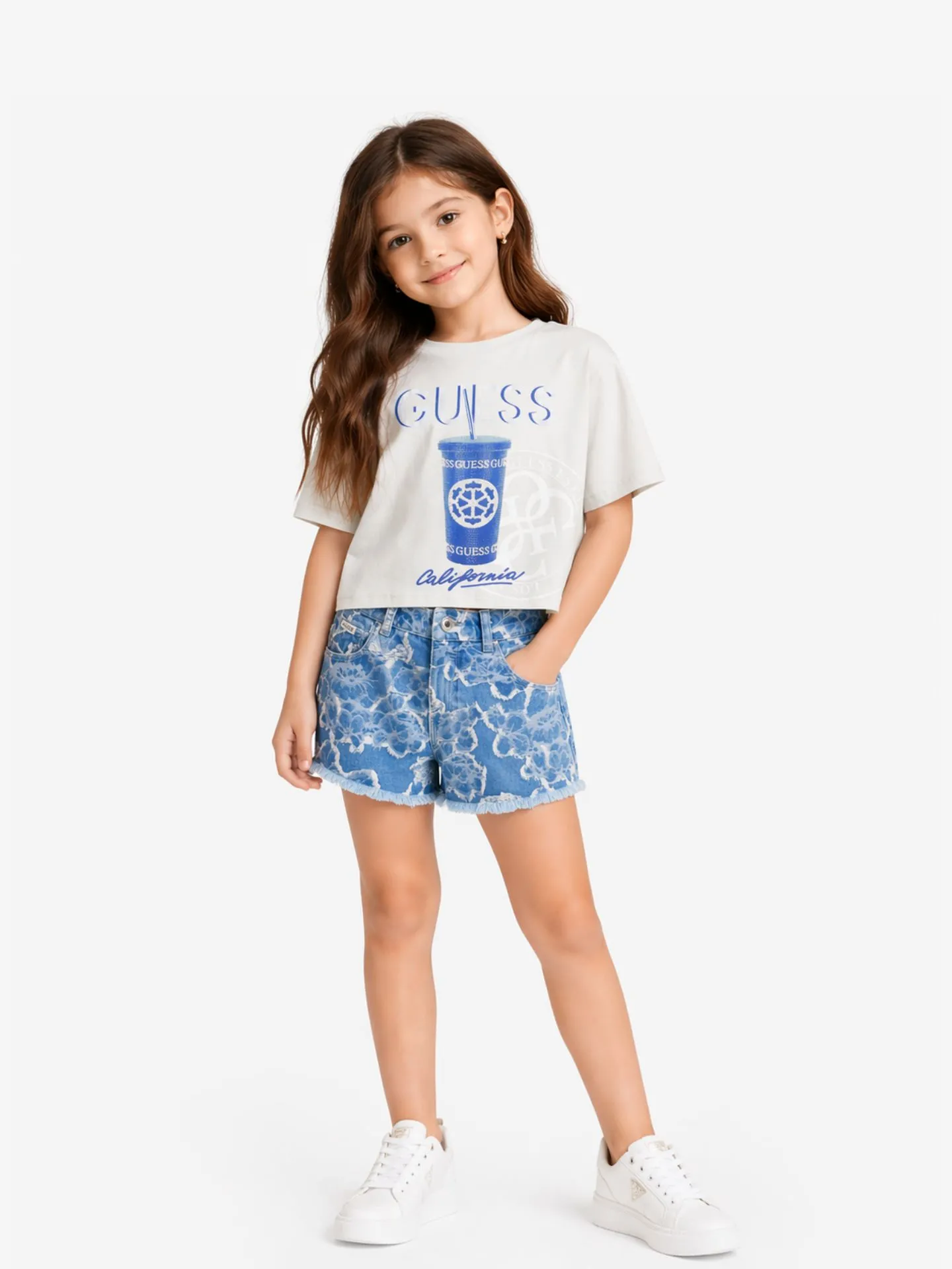 Dit witte Guess T-shirt voor kinderen heeft een opvallende blauwe grafische print op de voorkant. Centraal in het ontwerp staat een blauwe beker met een rietje, omringd door het herkenbare Guess-logo en de tekst California in een elegant lettertype. De tekst Guess is ook bovenaan de print te zien.