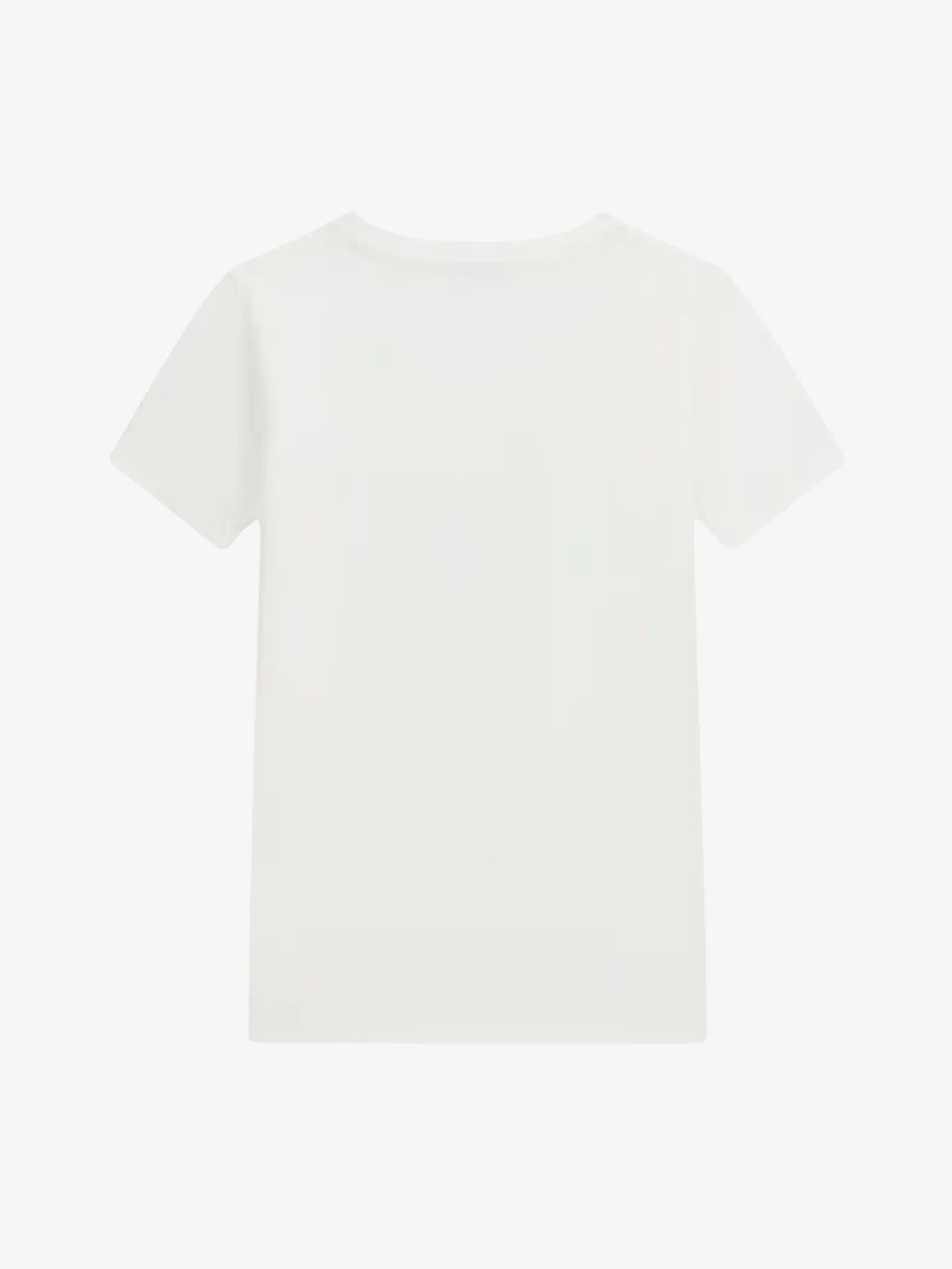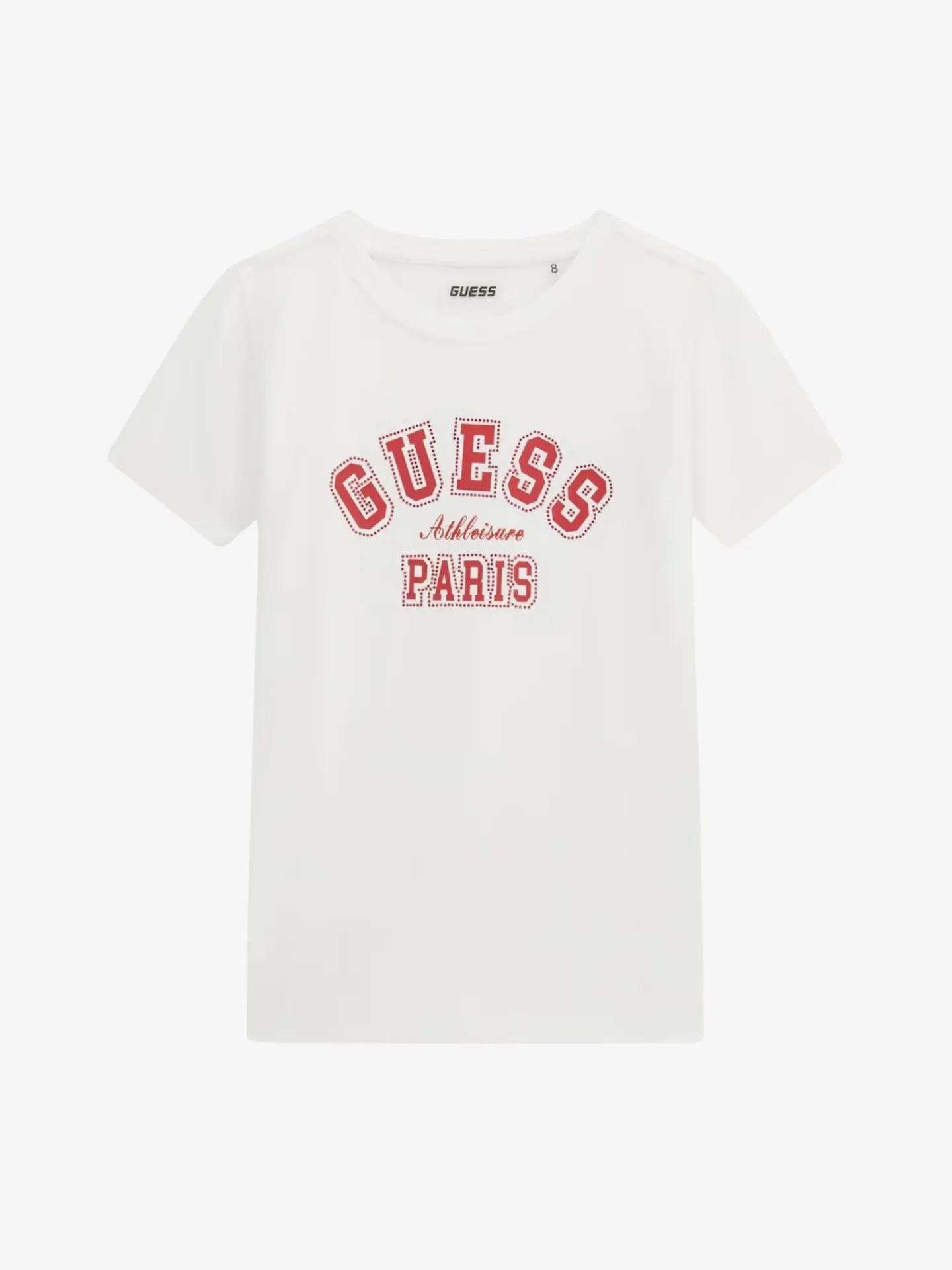 Het shirt heeft een klassieke pasvorm en is gemaakt van zachte stof. De voorkant is versierd met een opvallend Guess-logo dat is gedetailleerd met glinsterende strass-steentjes, wat zorgt voor een speelse touch. Dit T-shirt is veelzijdig en kan gemakkelijk worden gecombineerd met verschillende broeken, rokken of shorts voor een complete look.