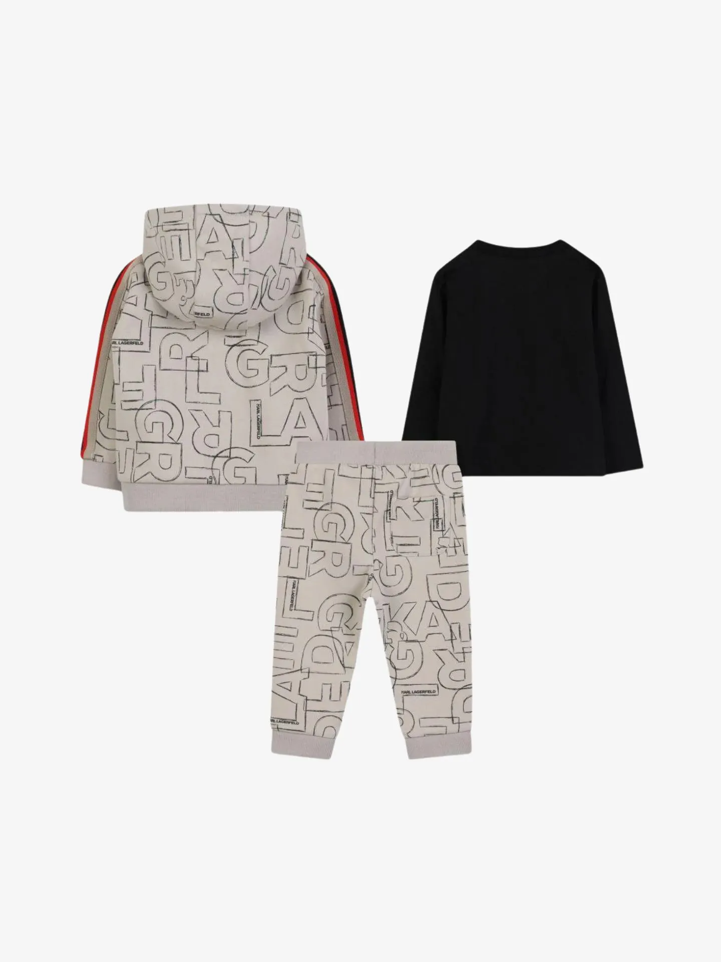 Grijs-beige maxi-set van katoen van Karl Lagerfeld, bestaande uit een jack met capuchon, bijpassende broek met all-over logo's en een zwart T-shirt met lange mouwen, logo en drukknoopsluiting op de schouder.