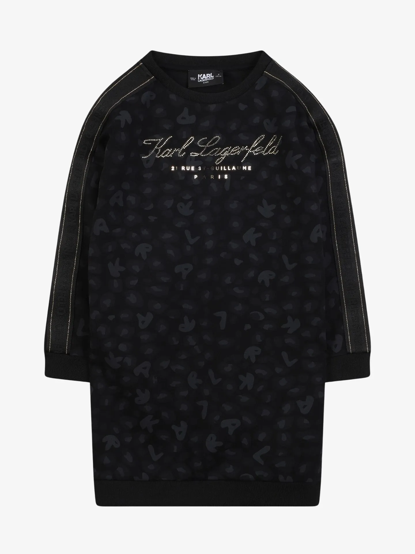 Met zijn opvallende luipaardprint belichaamt deze dubbele jersey jurk met lange mouwen een gedurfde en eigentijdse stijl. De jacquardvlecht met het KARL LAGERFELD KIDS-logo op de mouwen voegt een dimensie van luxe toe, terwijl de strass-illustratie en het gouden metallic effect op de voorkant voor een helder en chic contrast zorgen. Deze jurk is perfect voor een look die zowel dynamisch als verfijnd is en combineert comfort en sprankeling voor een modern silhouet vol karakter.
