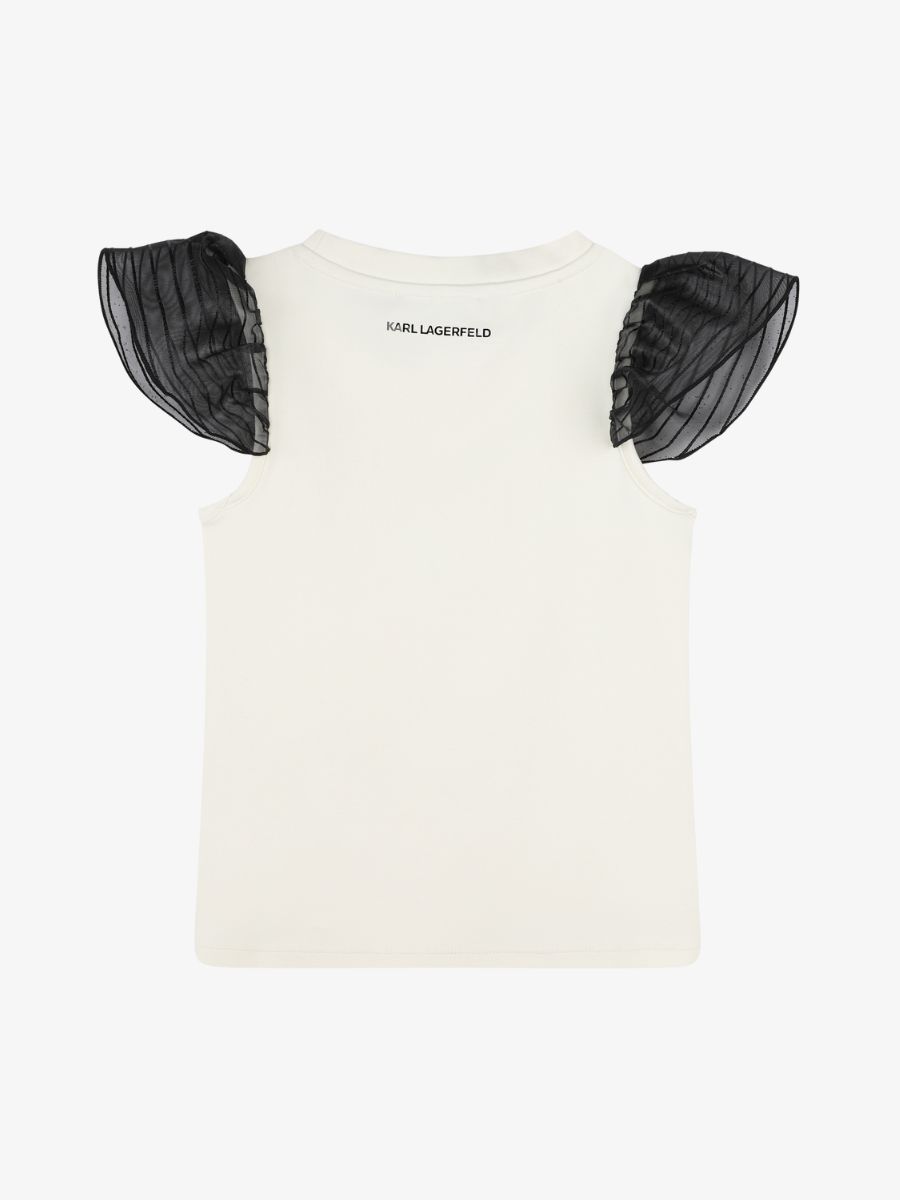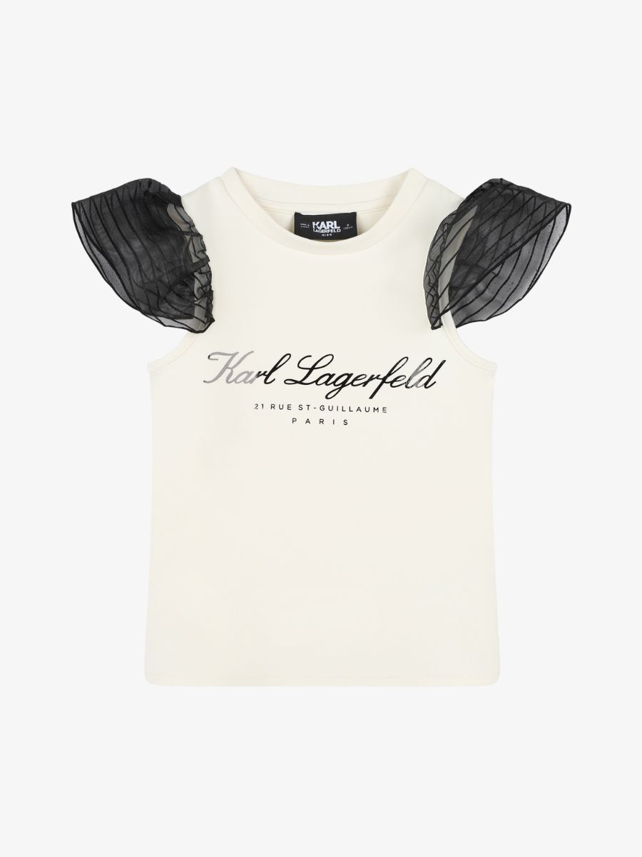 Dit mooie topje van Karl Lagerfeld valt op door de contrasterende mouwen van gestreept organza. Op de voorzijde prijkt een mooie logoprint. Combineer samen met de short en jasje.