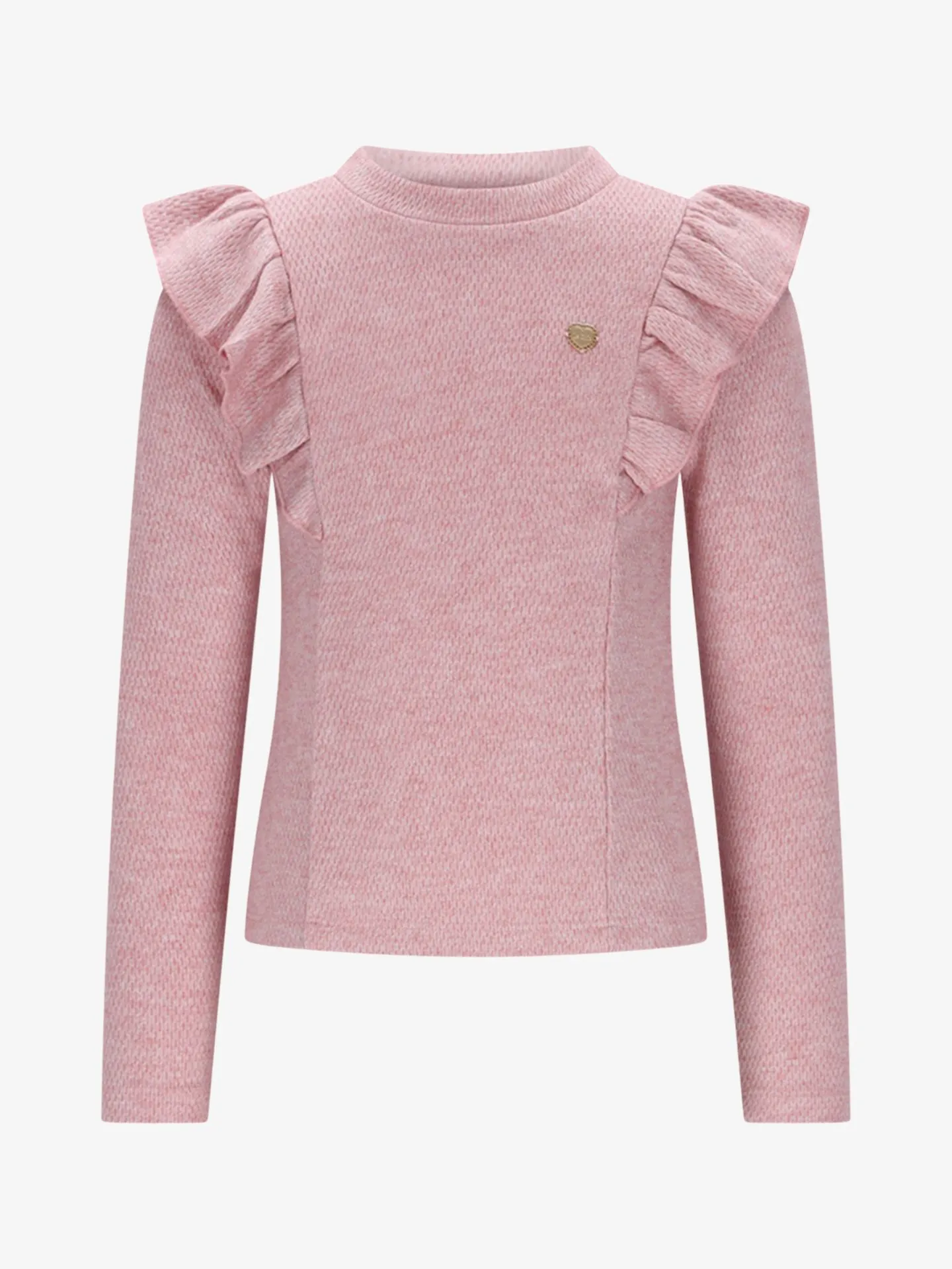 Le Chic top met lange mouwen en grote ruches op de schouders, verwerkt in een roze stof met subtiele glitters voor een feestelijke uitstraling. Gemaakt in een mooie, warme kleurdie helemaal past bij deze winter. Een stijlvol en speels item waar je meisje deze winter niet zonder kan