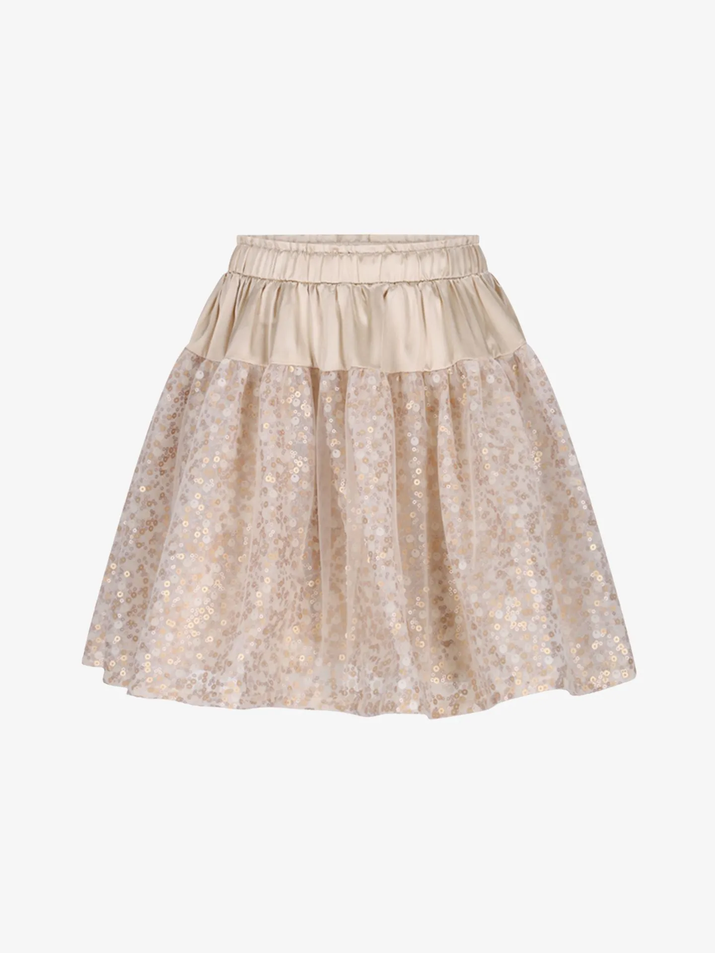 Le Chic rokje met glanzende heuppas en gouden pailletten een sprankelend ontwerp dat meteen opvalt. De gladde, glanzende pas geeft het rokje een chique uitstraling, terwijl de rok is versierd met fijne pailletten, subtiel afgedekt met een zachte tulelaag. De elastische tailleband zorgt voor extra comfort. Een feestelijk item voor speciale gelegenheden, of juist om van een gewone dag iets bijzonders te maken.