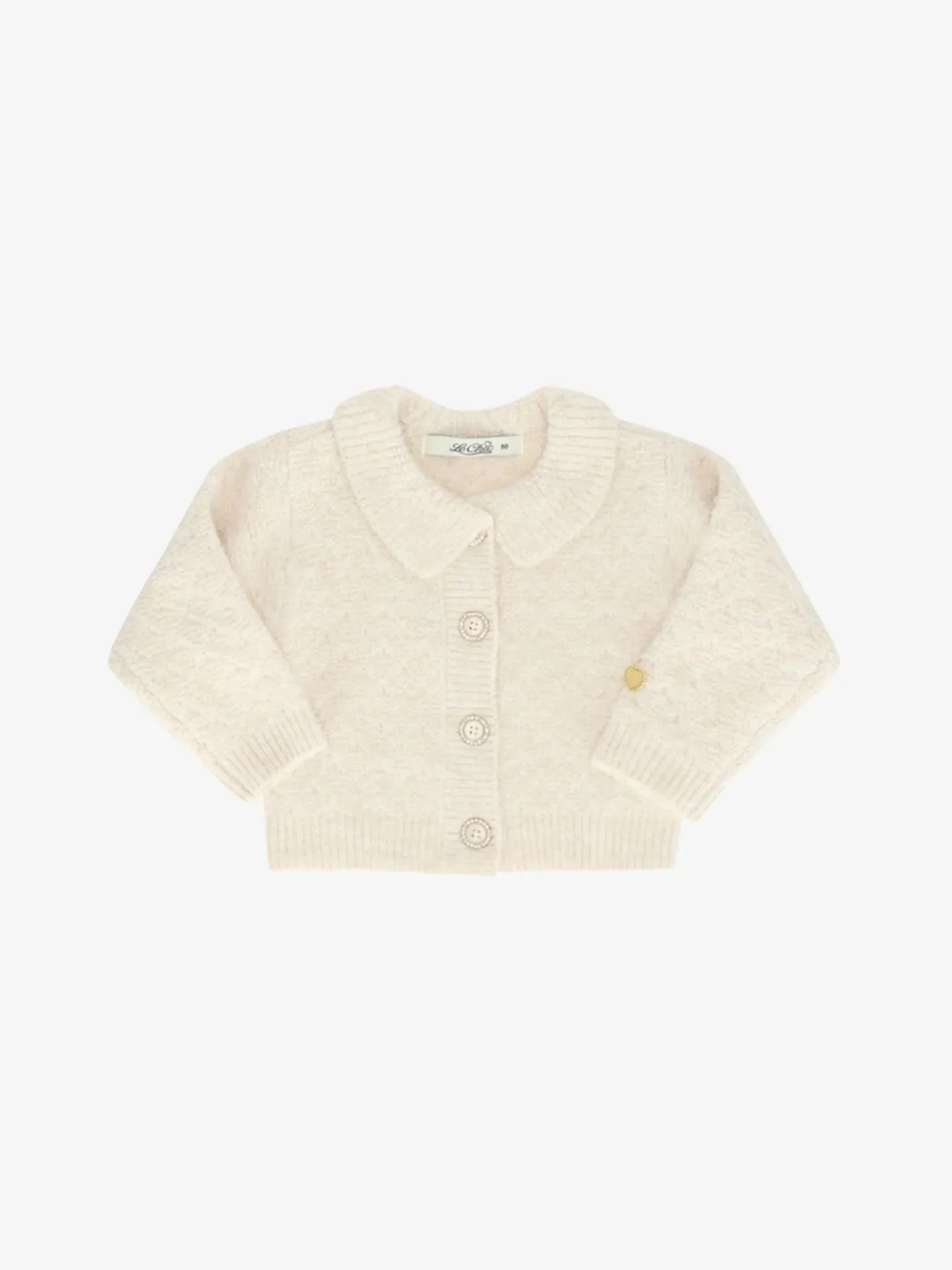 Le Chic vestje in een mooie gemeleerde off-white, in een stijlvol en fijn breisel, een trendy kraag en mooie knopen. Dit warme vestje is perfect voor gezellige momenten binnen en buiten, en geeft jouw meisje een comfortabele en modieuze look. Een veelzijdige must-have voor haar garderobe.