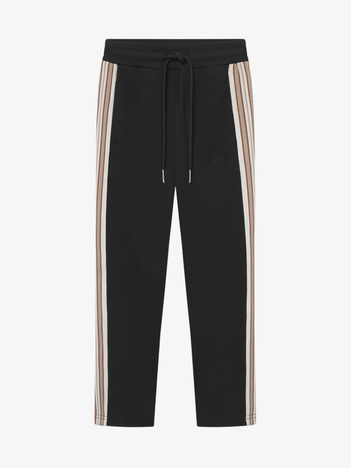 Zwarte joggingbroek van het merk Les Deux. De broek heeft een elastische tailleband, aantrekkoordjes en contrasterende biezen aan de zijkanten van de broekspijpen.