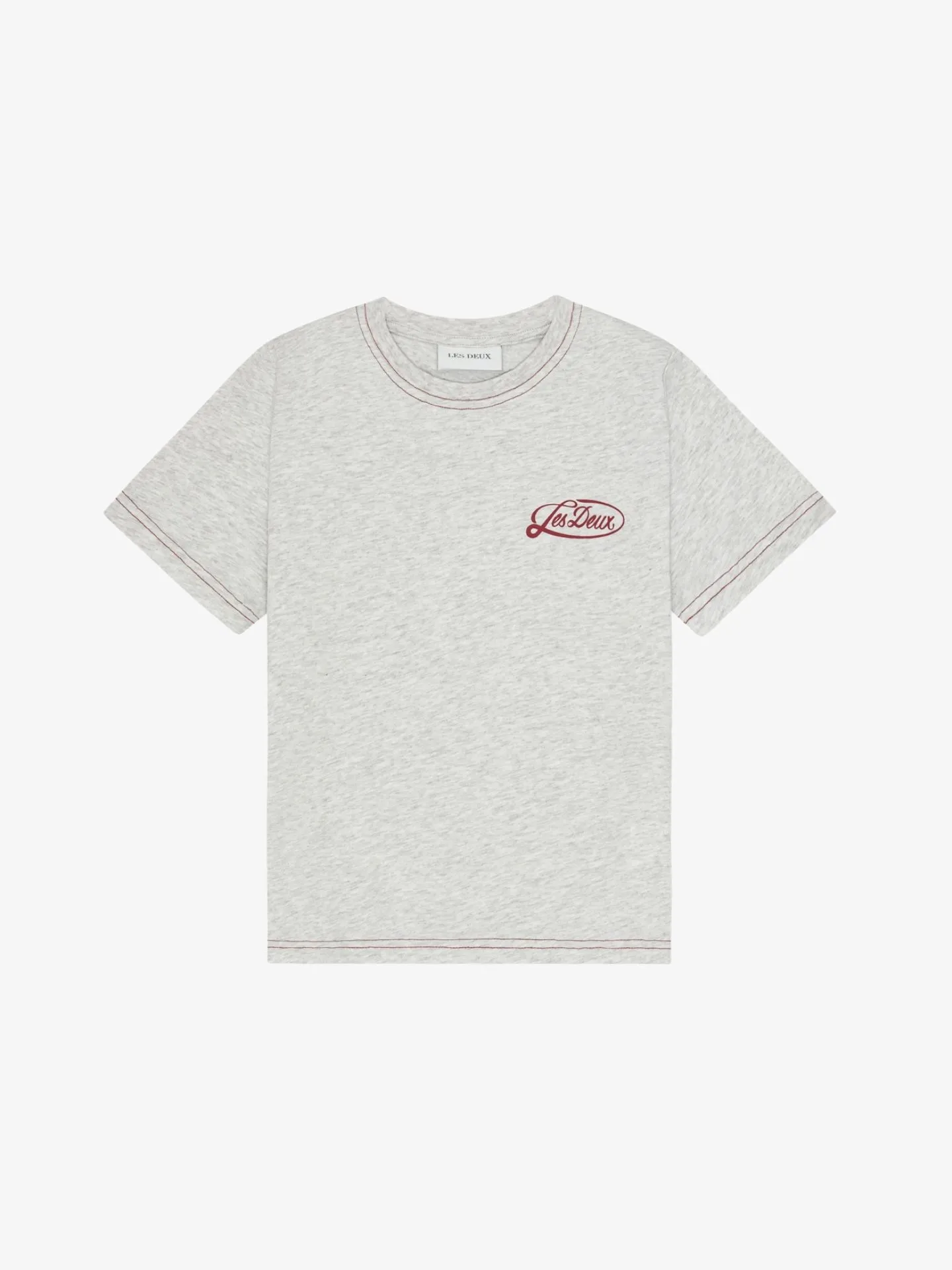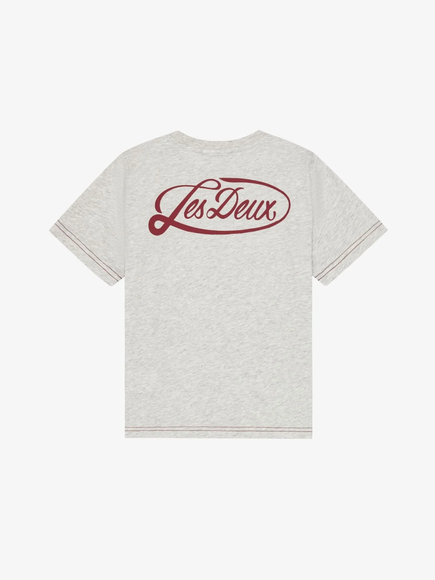 T-shirt van het Deense merk Les Deux. Het T-shirt in de kleur Snow Melange heeft een ronde hals, korte mouwen, een kleine merk opdruk aan de voorzijde van het shirt en een grote opdruk aan de achterzijde.