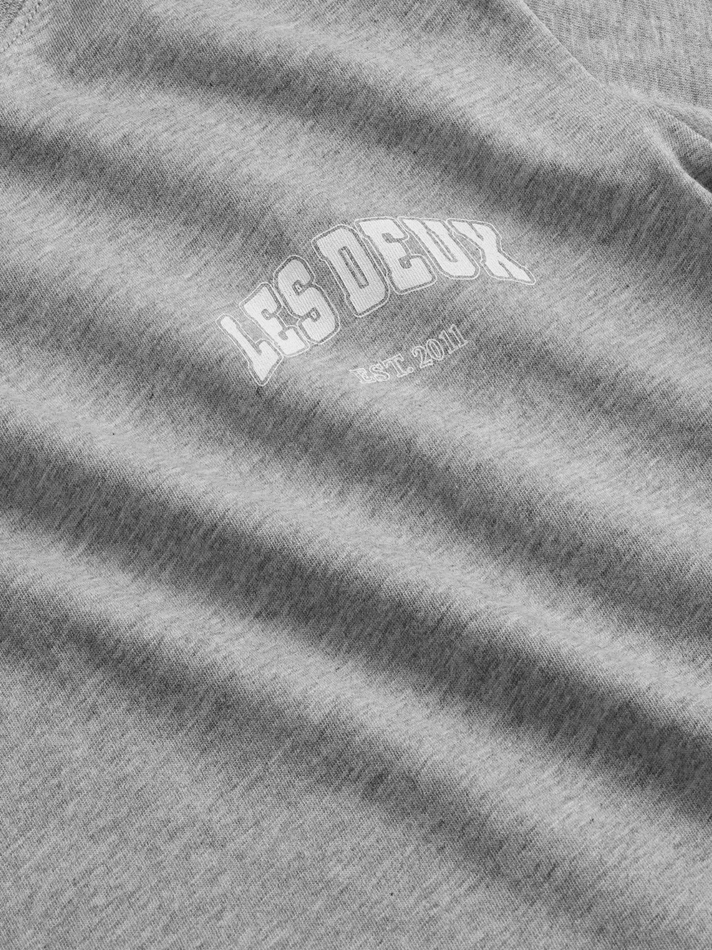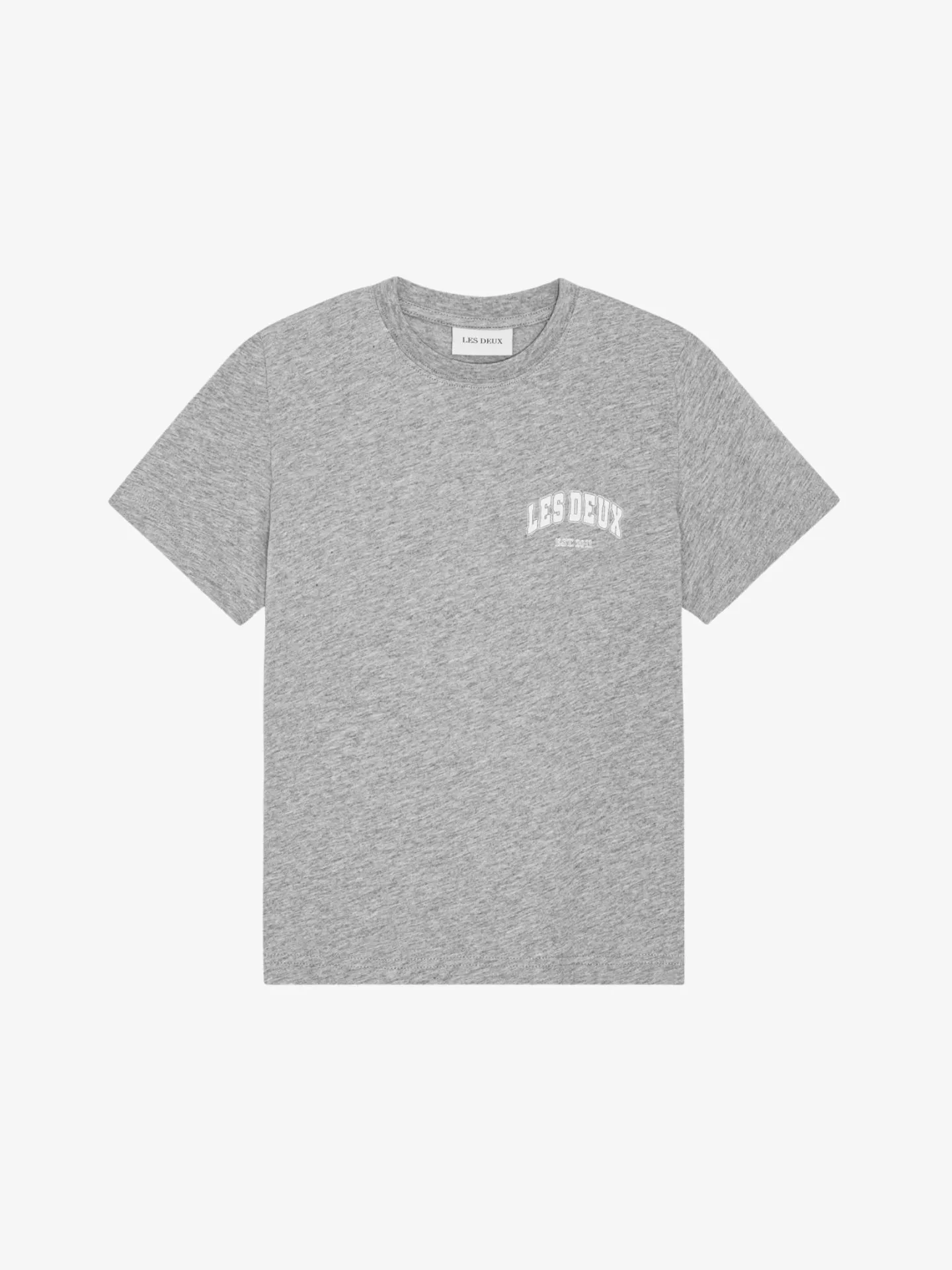 Grey melange T-shirt van het Deense merk Les Deux. Het T-shirt heeft een ronde hals, korte mouwen, klein logo aan de voorzijde en een groot merk logo aan de achterkant.