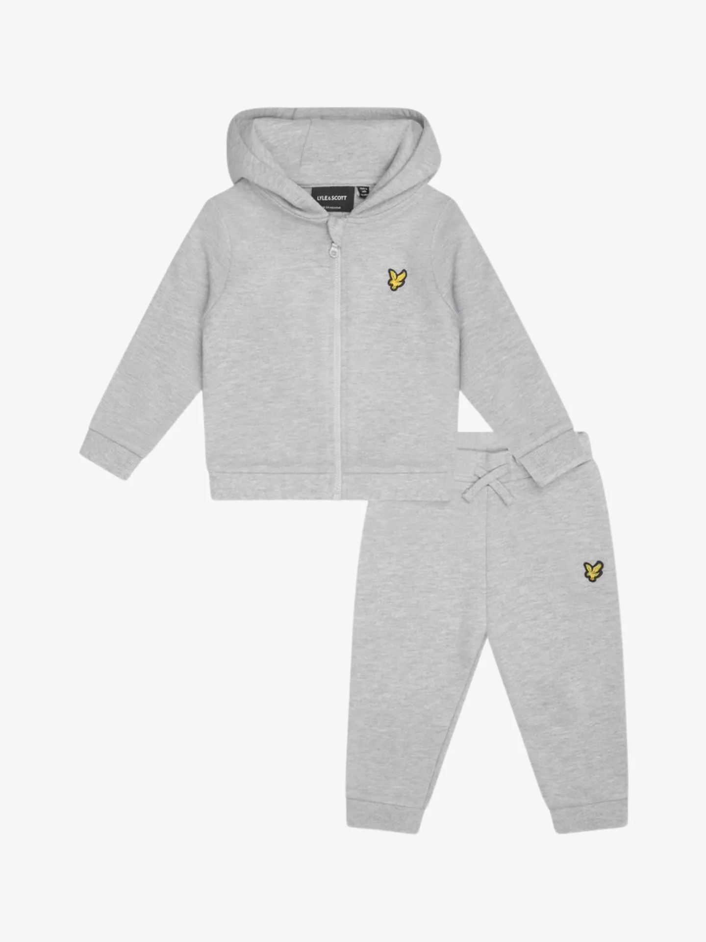 Het Lyle and Scott Baby Joggingpak in de kleur Light Grey Marl bestaat uit een vest en joggingbroek. De joggingbroek kun je aansnoeren in de taille. Het vest en broek hebben het gele logo embleem.