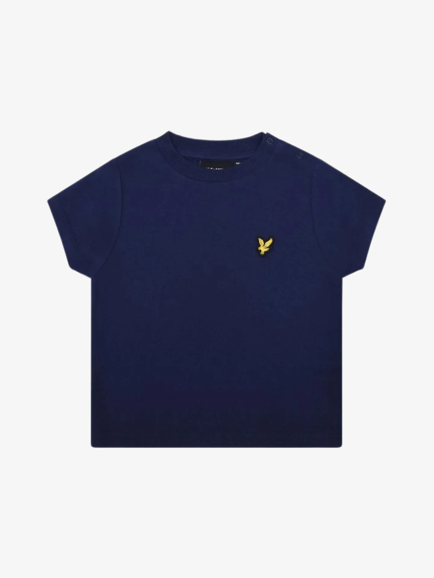 Het Lyle and Scott Baby t-shirt in de kleur Navy heeft een knoopsluiting op de schouder en het gele embleem op de borst. Combineer samen met het bijpassende joggingpak.