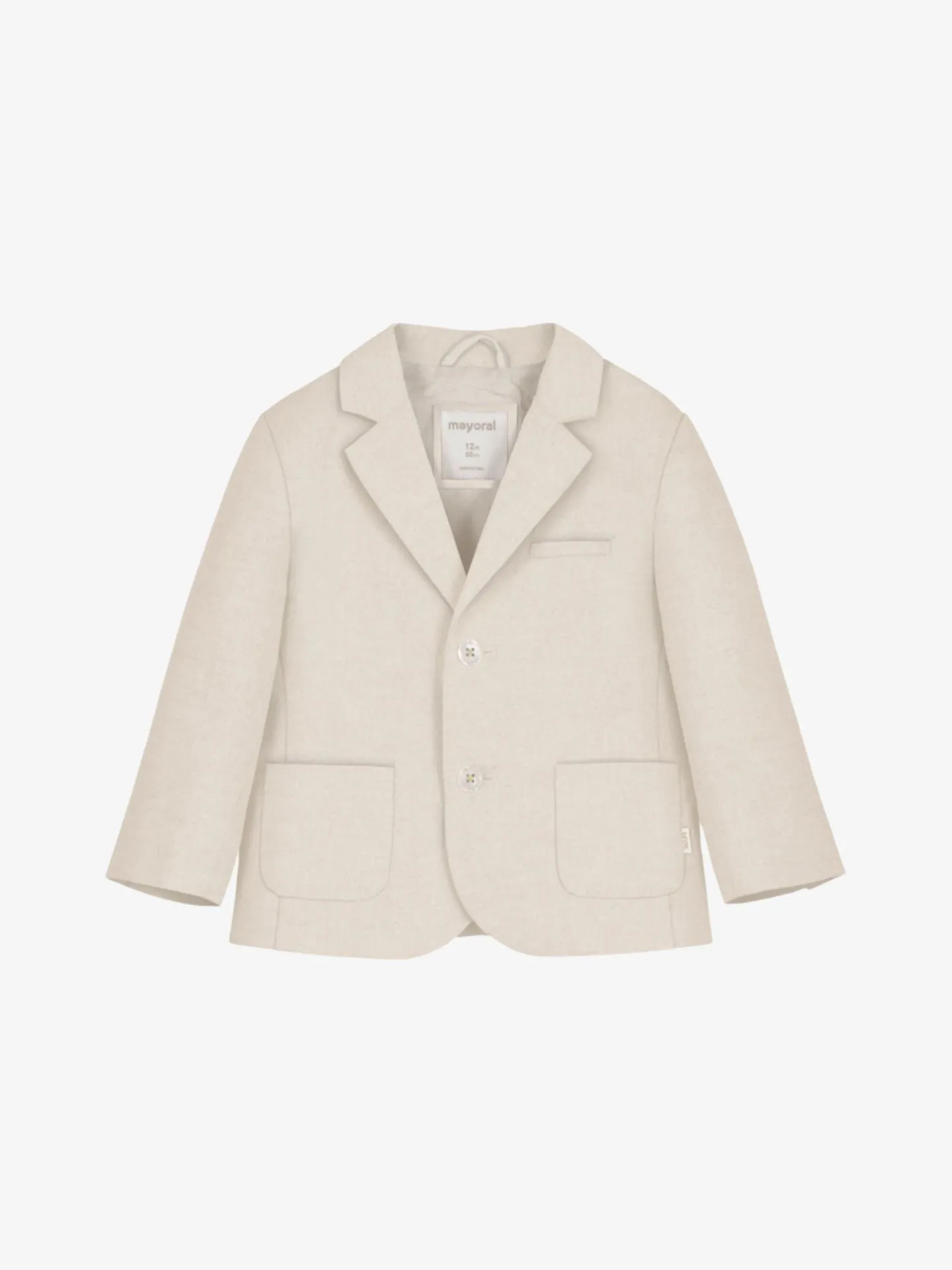 Linnen colbert van het Spaanse merk Mayoral. Het colbert in de kleur Oat Mixed heeft lange mouwen, platte kraag, knoopsluiting en steekzakken aan de voorzijde.