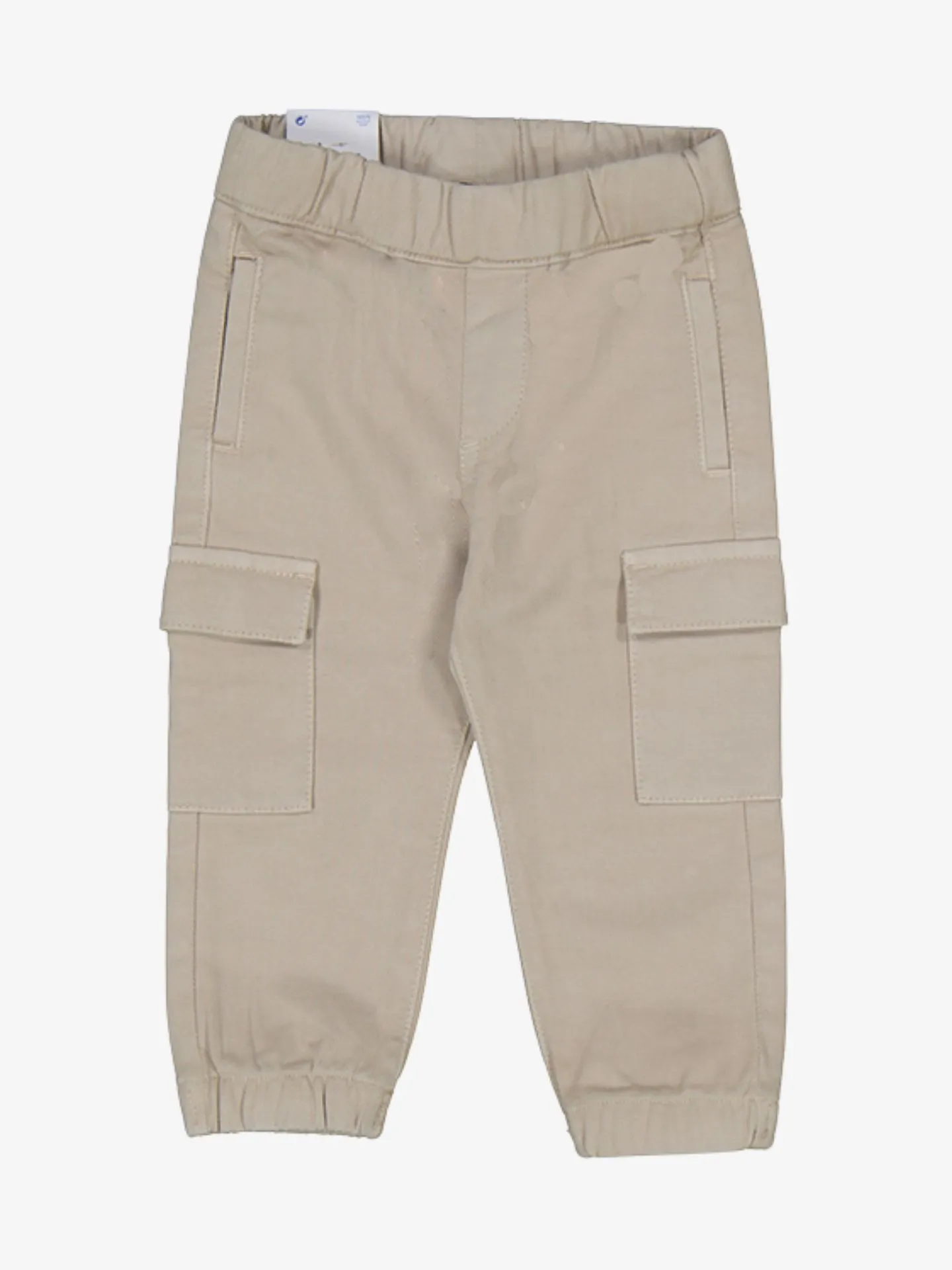 Cargobroek voor babys, losjes aan de bovenkant, losvallend in de taille en normale pasvorm aan de pijpen. Verstelbaar elastiek met knopen aan de binnenkant van de tailleband voor een betere pasvorm. Ontwerp met meerdere zakken.