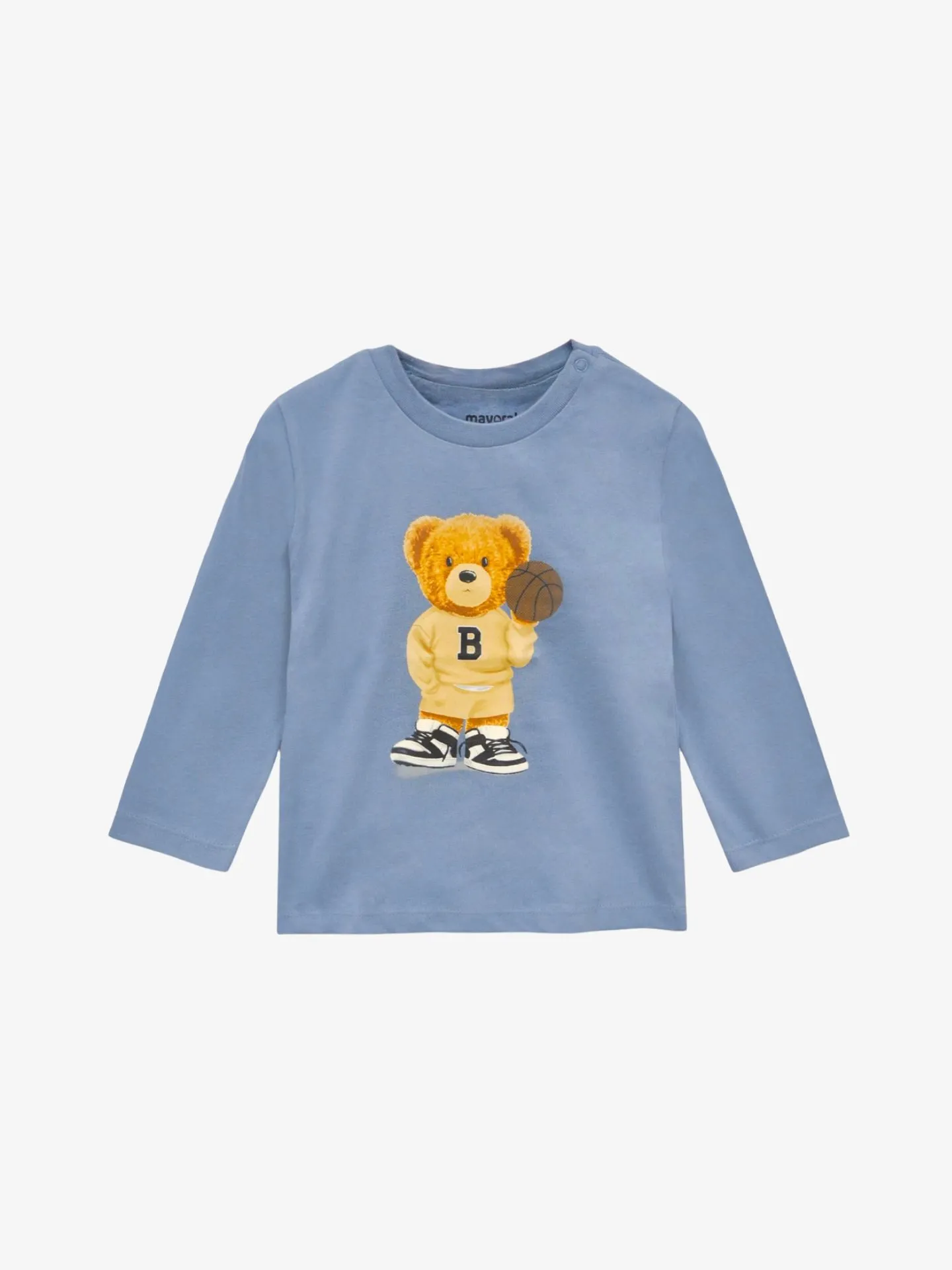 De Mayoral Longsleeve in de kleur Iceberg heeft een print met een beer met een basketbal. Het shirt kan gemakkelijk gecombineerd worden met het joggingpak.