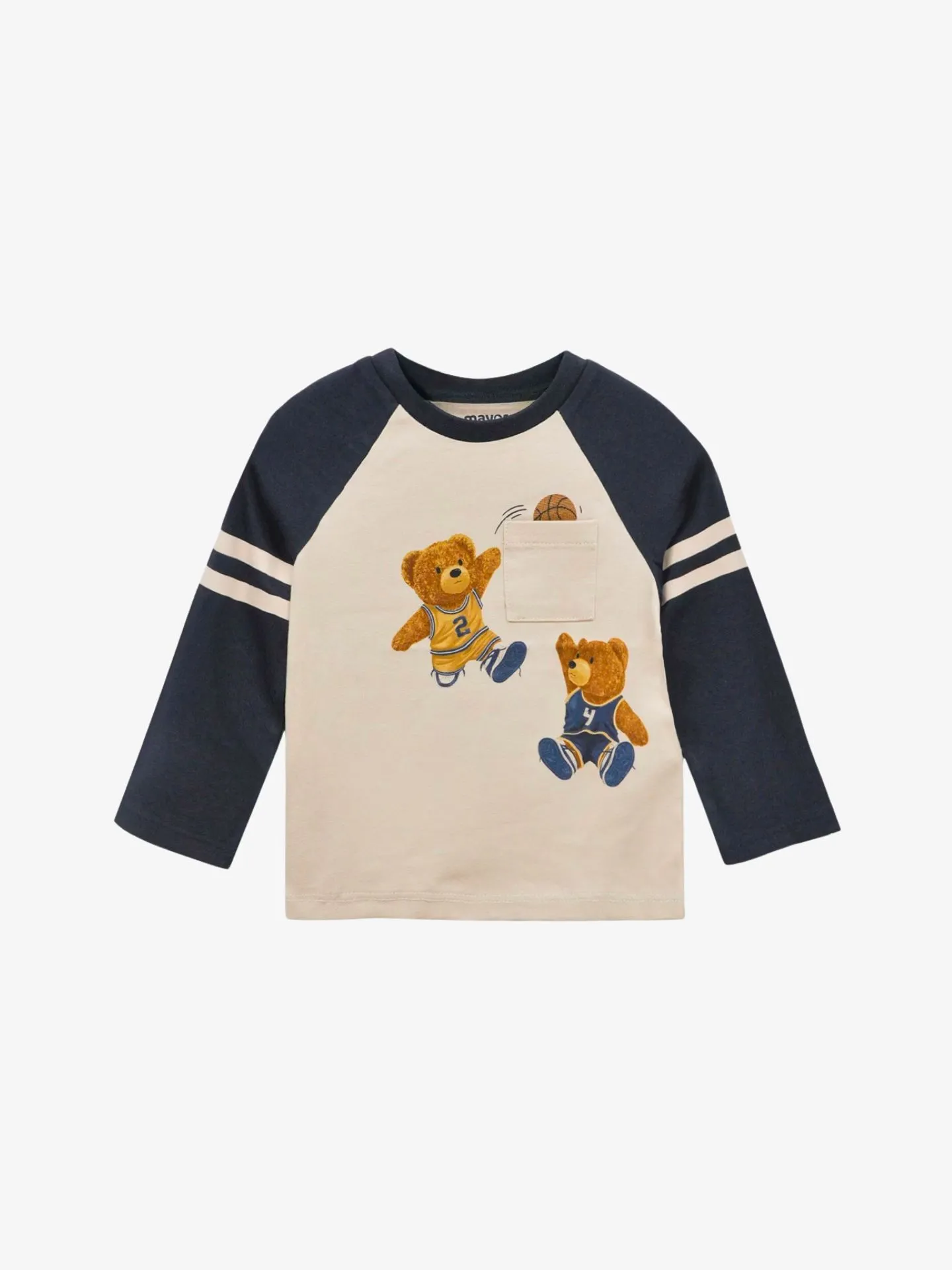 De Mayoral Longsleeve in de kleur Night heeft een borstzakje en contrasterende mouwen met twee strepen. Het shirt heeft een print met beren in een basketbal thema.