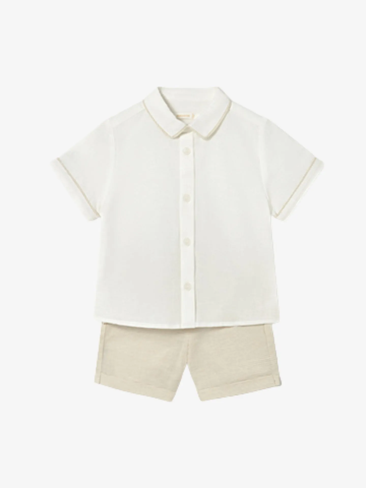 2-delige set van het Spaanse merk Mayoral. De set bestaat een blouse en bermuda. De blouse heeft korte mouwen, knoopsluiting en beige sierbiesje langs de kraag en op de mouwen. De bermuda heeft een knoopsluiting, riemlussen, verstelbaar elastiek in de taille, steekzakken en opgestikte zakken aan de achterzijde.