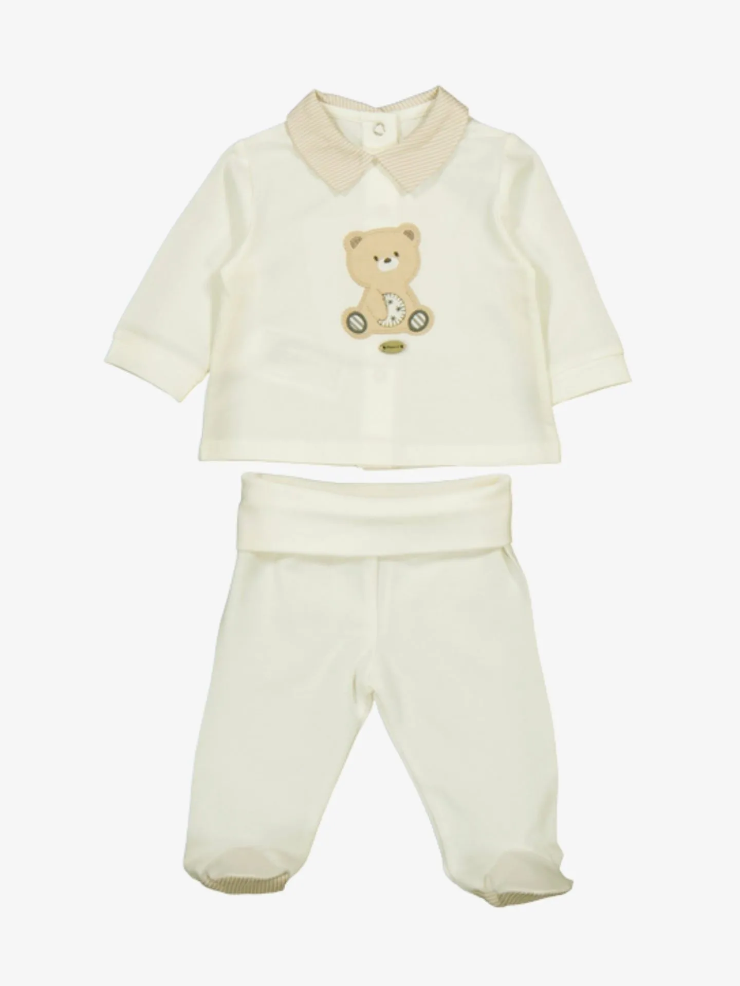 2-delige set van het Spaanse merk Mayoral. De set bestaat uit een trui en broekje met voetjes. De trui heeft een gestreept kraagje, elastische boorden en een opdruk aan de voorzijde. De broek heeft een elastische tailleboord.