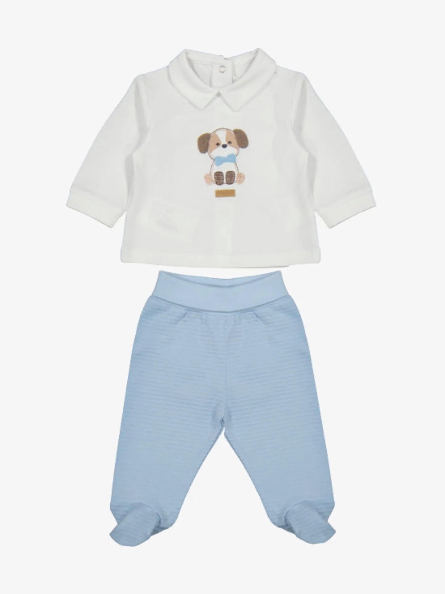 2-delige set van het Spaanse merk Mayoral. De set bestaat uit een trui en broekje met voetjes. De trui heeft een gestreept kraagje, elastische boorden en een opdruk aan de voorzijde. De broek heeft een elastische tailleboord.