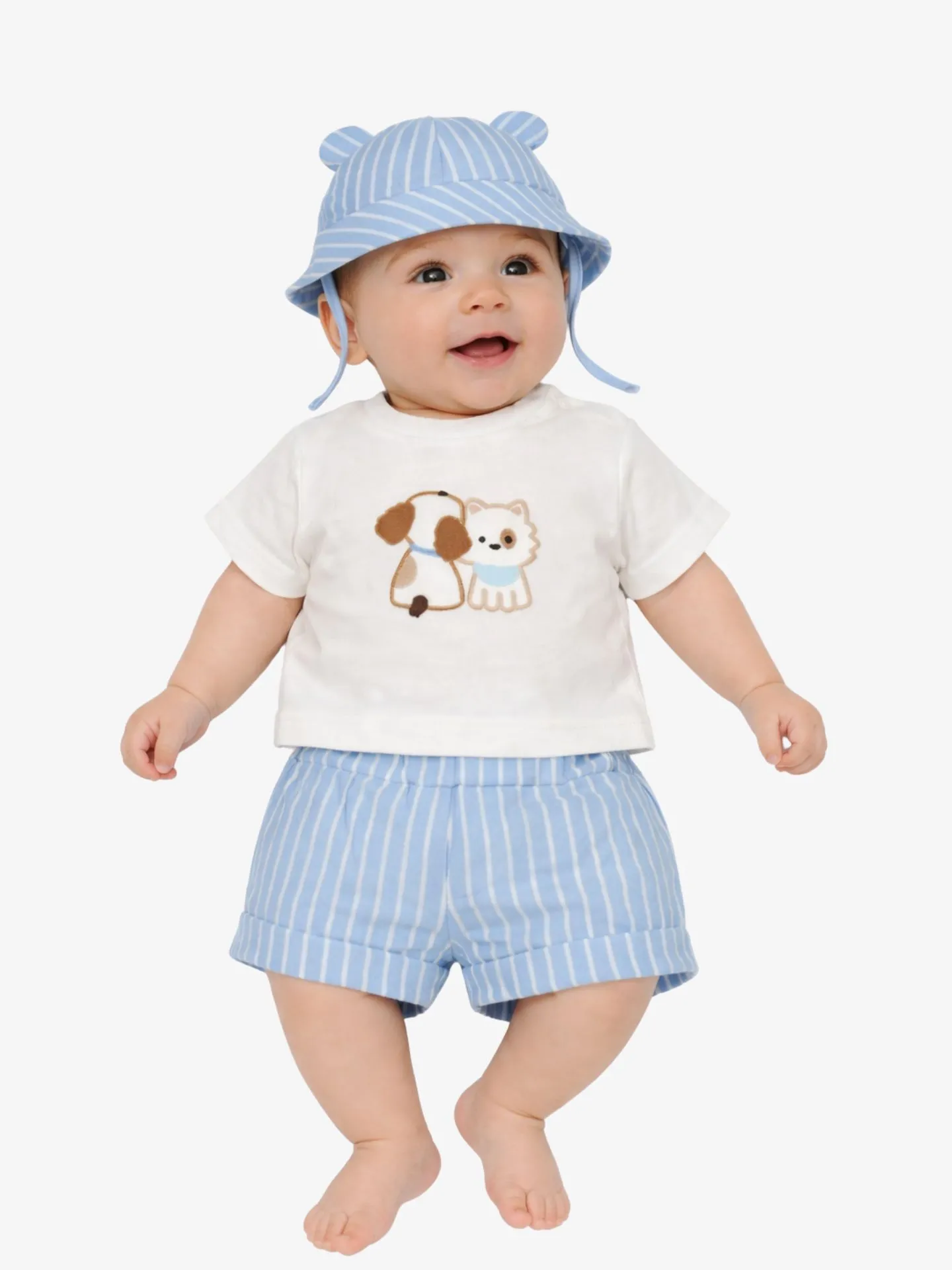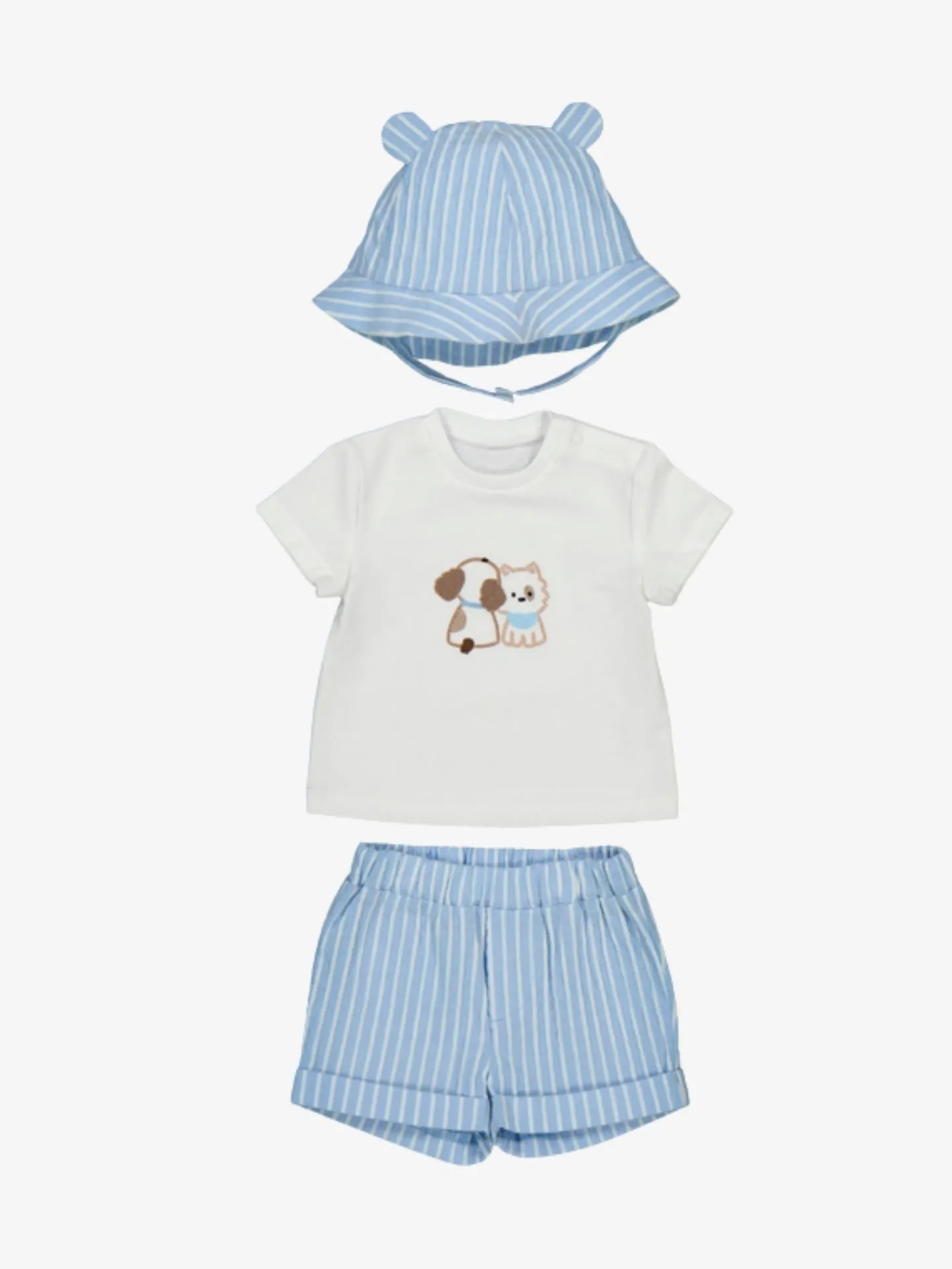 3-delige set van het Spaanse merk Mayoral. De set bestaat uit een T-shirt, short en zonnehoed. Het T-shirt heeft een ronde hals, korte mouwen en een opdruk aan de voorzijde. De gestreepte short heeft een elastische tailleband, verstelbaar elastiek in de taille en steekzakken aan de voorzijde. Het zonnehoedje heeft oortjes en een verstelbaar bandje.