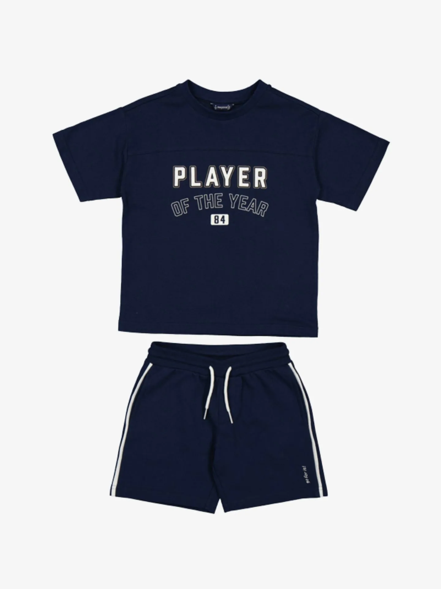 2-delige set van het Spaanse merk Mayoral. Het t-shirt heeft korte mouwen, ronde hals en een opdruk aan de voorzijde. De short heeft een elastische tailleband, aantrekkoordjes en sierstrepen aan de zijkant.