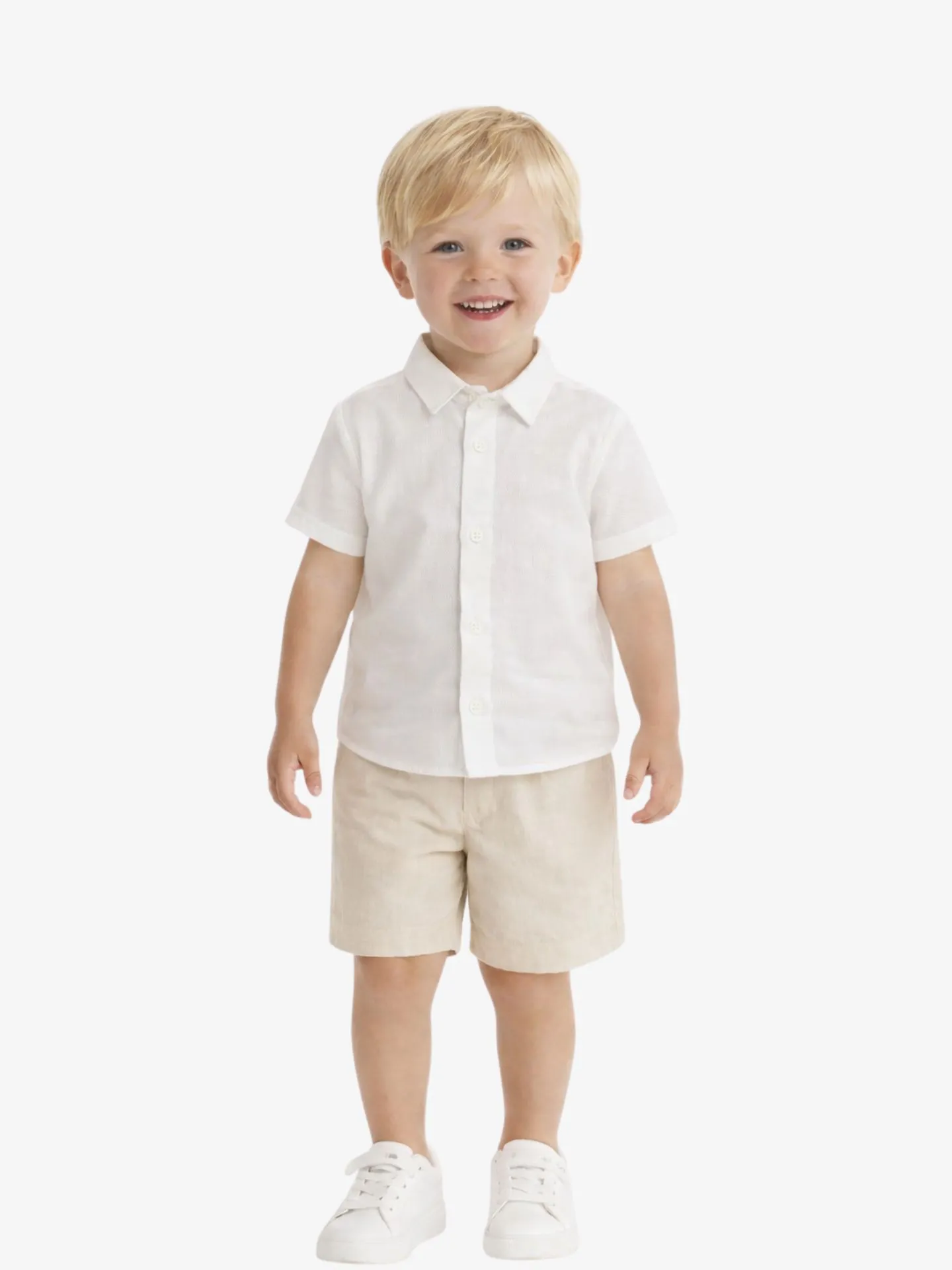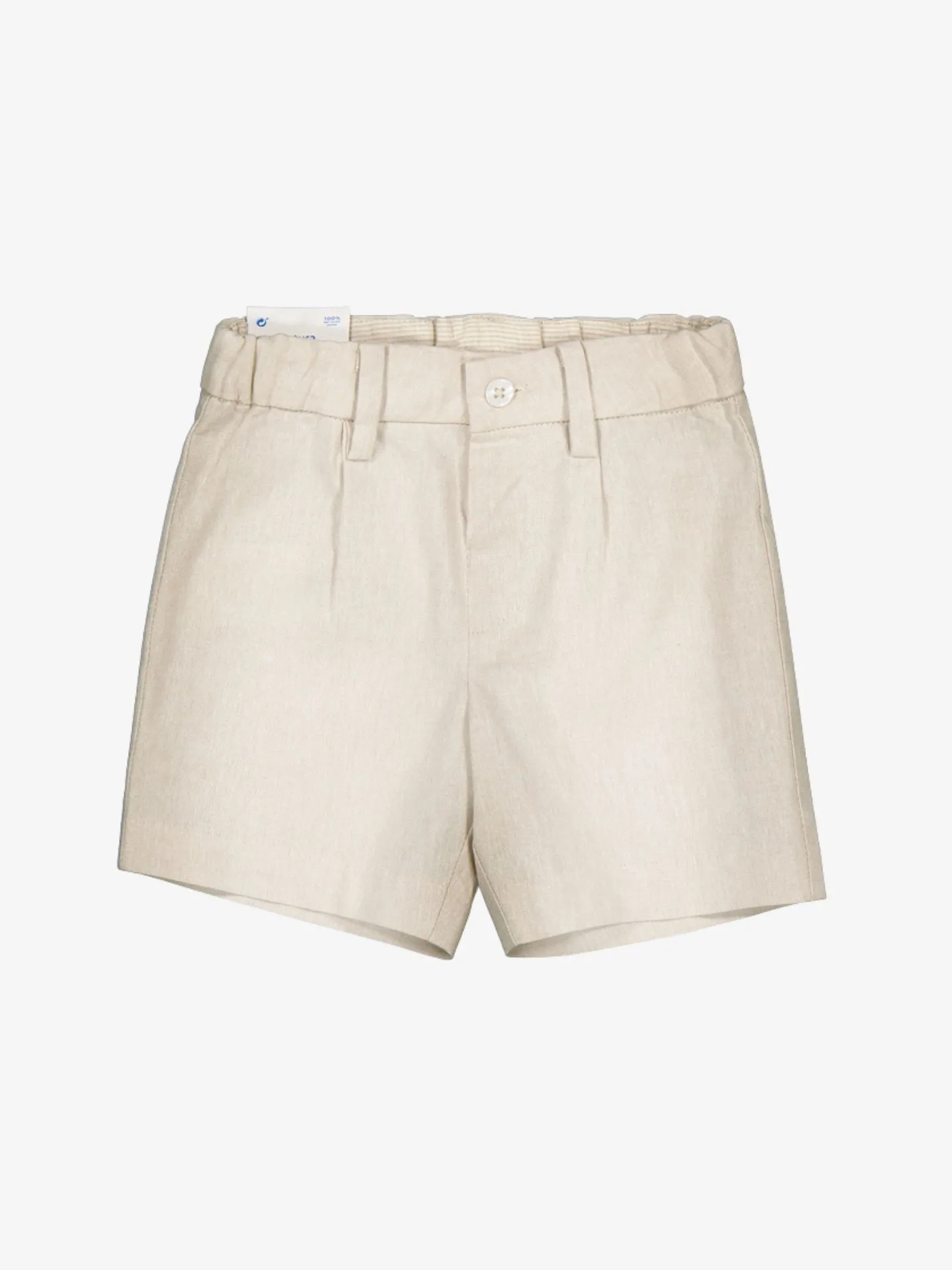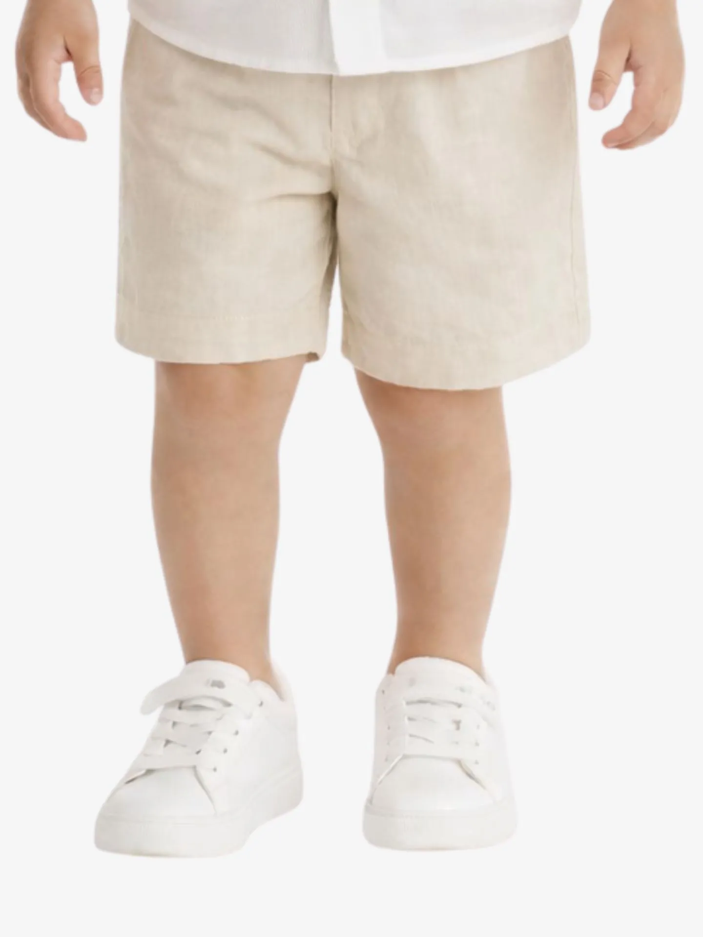 Bermuda in de kleur Oat mixed van het Spaanse merk Mayoral. De bermuda heeft een knoopsluiting, riemlussen, verstelbaar elastiek in de taille, steekzakken en opgestikte zakken aan de achterzijde.