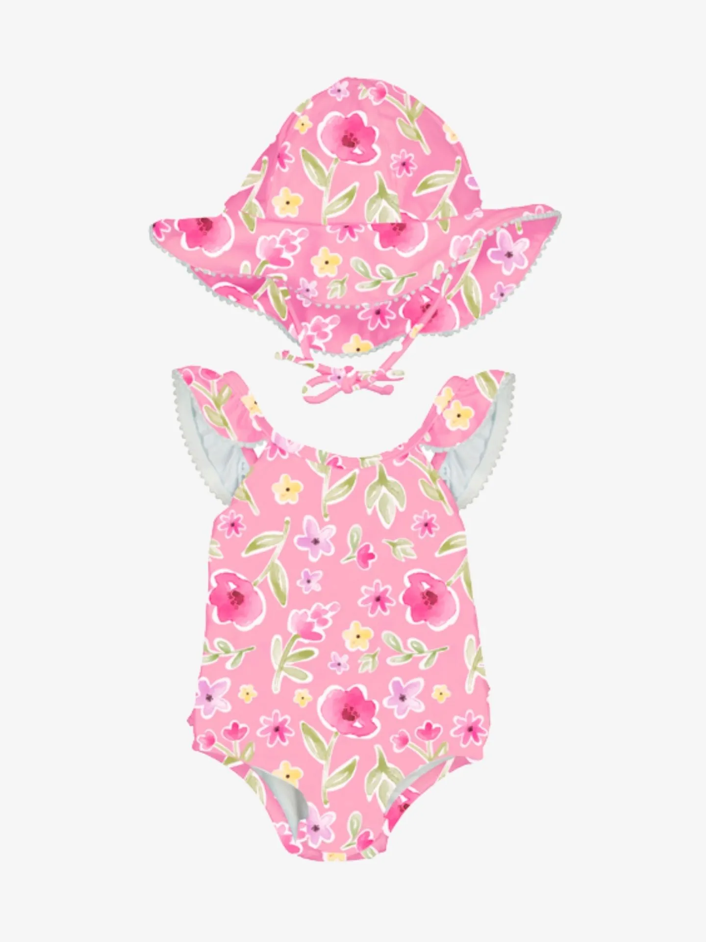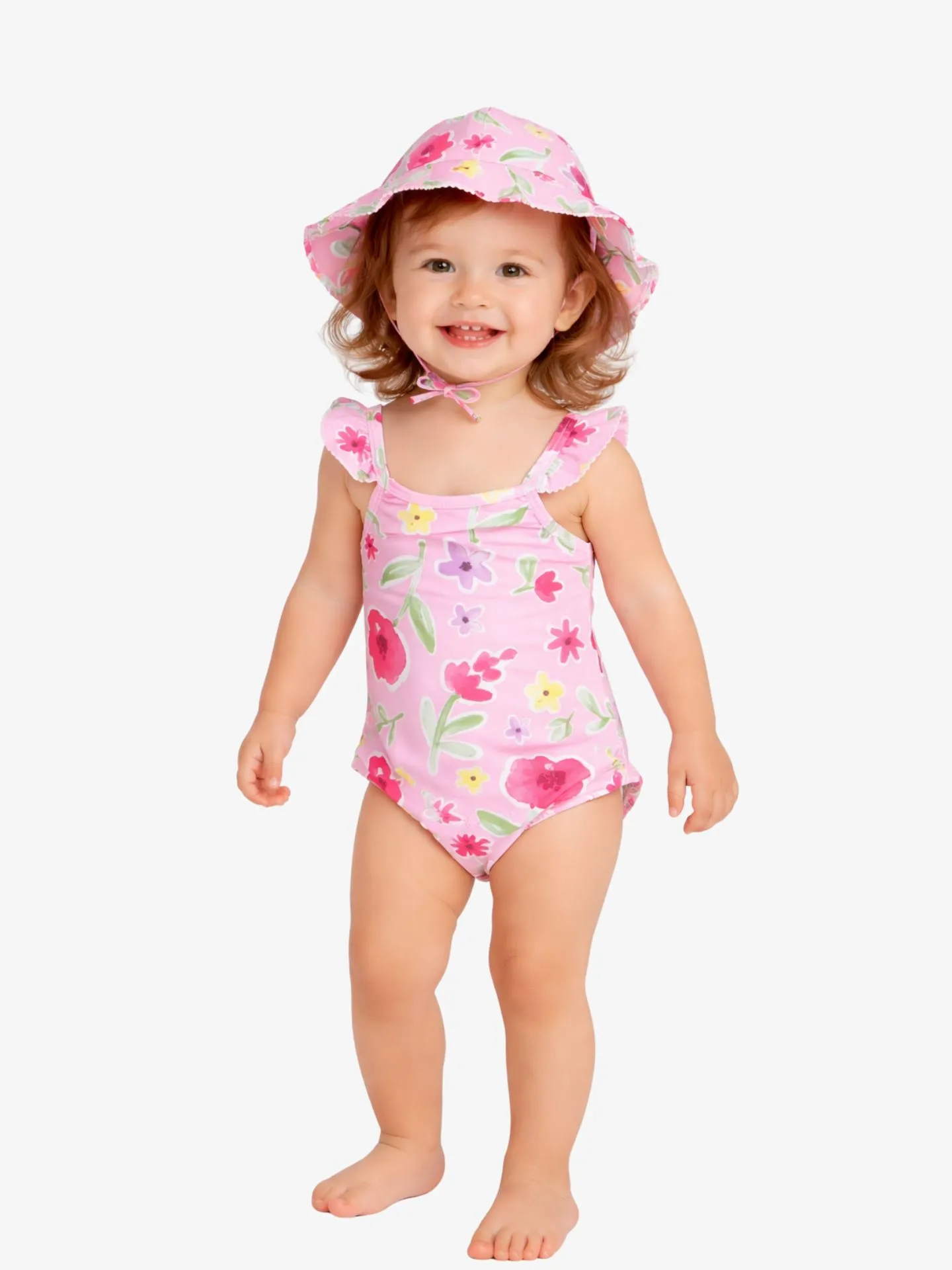 2-delige set an het Spaanse merk Mayoral. De set bestaat uit een badpak en zonnehoed. Het badpak heeft een all-over bloemen print en ruches op de schouderbandjes. Het zonnehoedje kan vastgeknoopt worden met de koordjes aan de binnenzijde van de hoed.