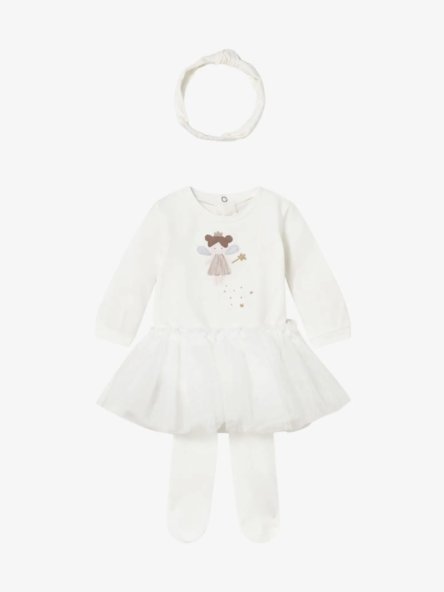 Driedelige set voor pasgeborenen. Rompertjes met lange mouwen en elastische boorden voor pasgeborenen. Ronde hals. Drukknoopsluiting aan de achterkant. Drukknoopsluiting in het kruis voor gemakkelijk aankleden. Decoratieve elementen: glitter, print. Strak geweven panty voor pasgeborenen met elastische tailleband voor een betere pasvorm. Ontwerp met overlappende rok over de panty. Originele hoofdband voor pasgeborenen. Perfecte accessoire om de look compleet te maken.
