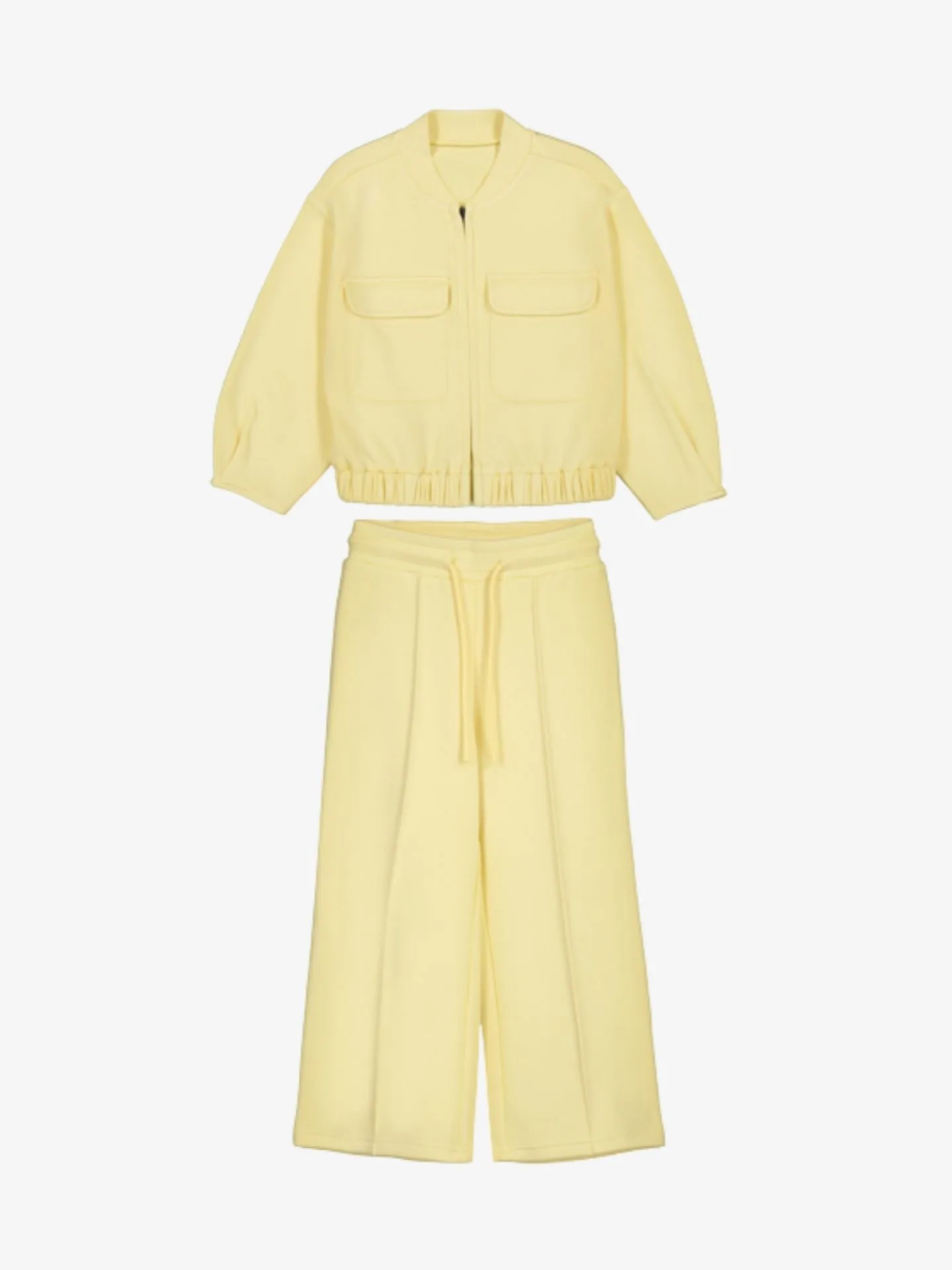 2-delige set van het Spaanse merk Mayoral. Het joggingpak in de kleur Vanilla Yellow bestaat uit een jasje en lange pantalon. Het jasje heeft een ritssluiting, pofmouwen, opgestikte zakken aan de voorzijde en elastische boorden. De pantalon met wijde broekspijpen heeft een elastische tailleband met aantrekkoordjes en steekzakken aan de voorzijde.