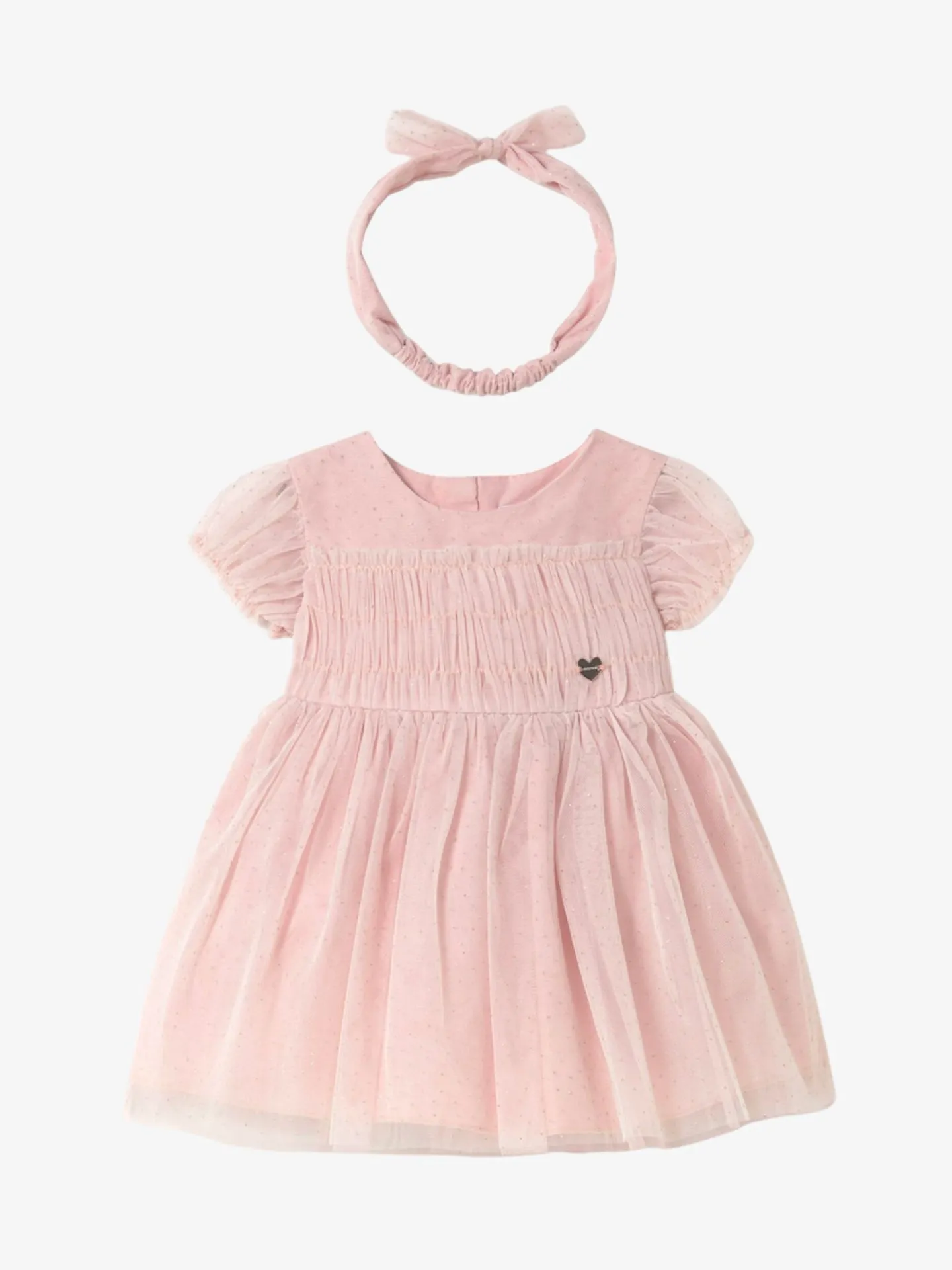 De Mayoral jurk in de kleur Rose is een tulle jurk met pofmouwen en een bijpassende haarband. Super leuk voor een feestje of verjaardag. De jurk heeft een ritssluiting op de rug.