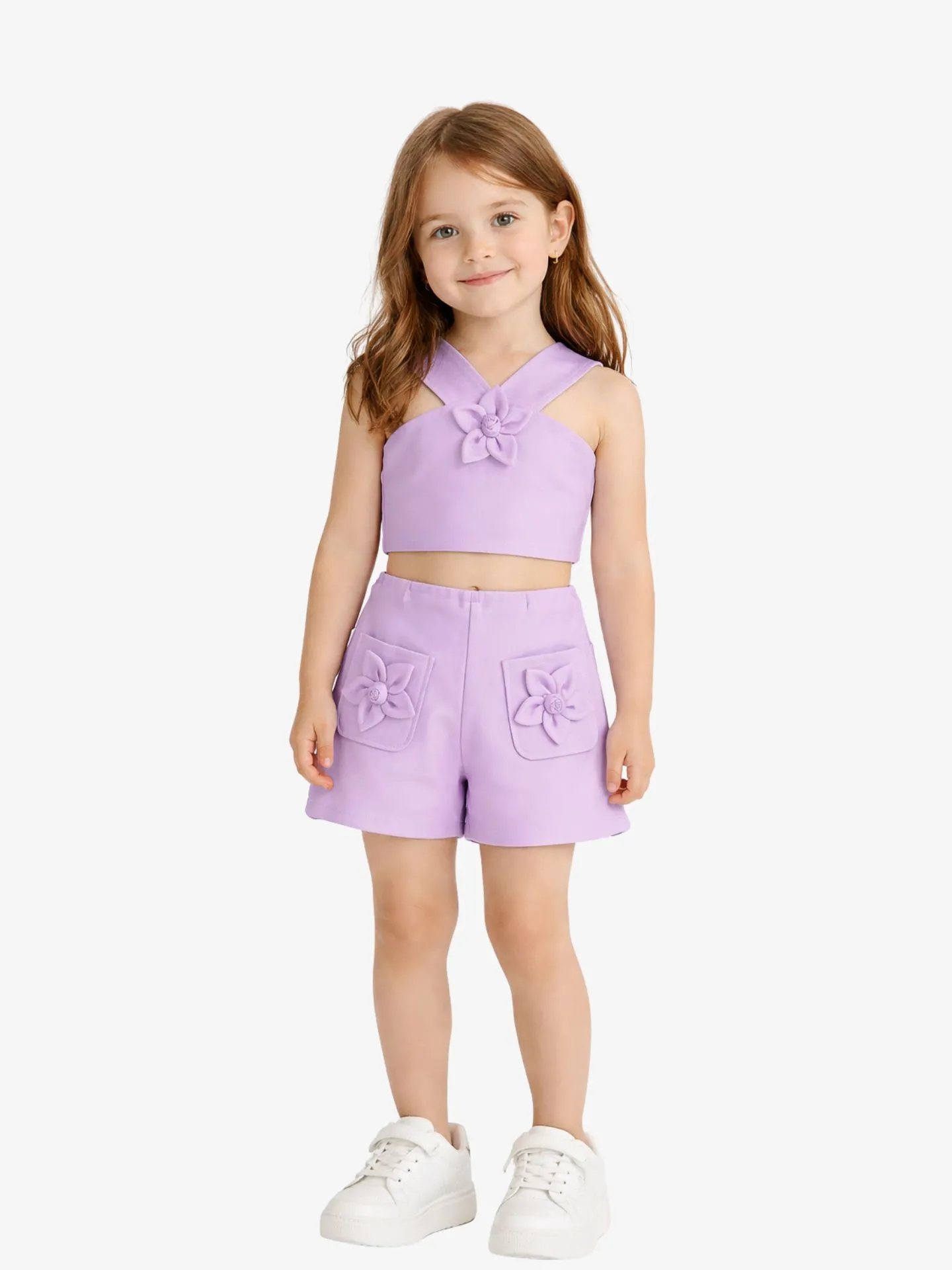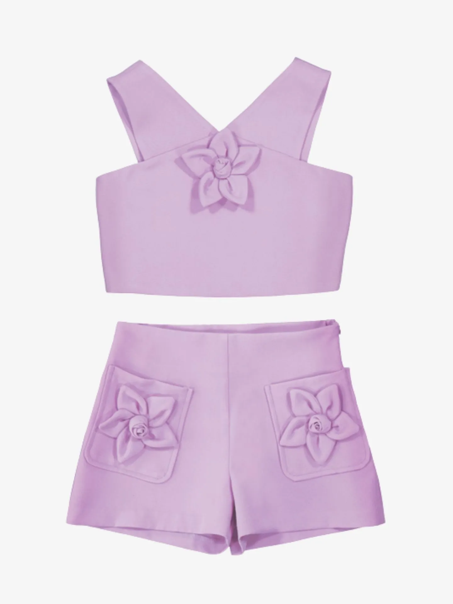 2-delige set van het Spaanse merk Mayoral. De set bestaat uit een top en bermuda. De mouwloze top heeft brede schouderbandjes en een bloem applicatie aan de voorzijde. De short heeft een elastische tailleband, opgestikte zakken met bloemen details aan de voorzijde.