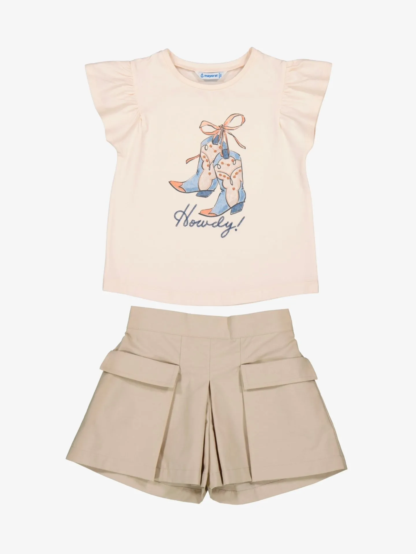 2-delige set van het Spaanse merk Mayoral. De set bestaat uit een T-shirt en short. Het t-shirt heeft een ronde hals, korte mouwen met ruches en een opdruk aan de voorzijde. De plooishort heeft een elastische tailleband en grote opgestikte zakken.